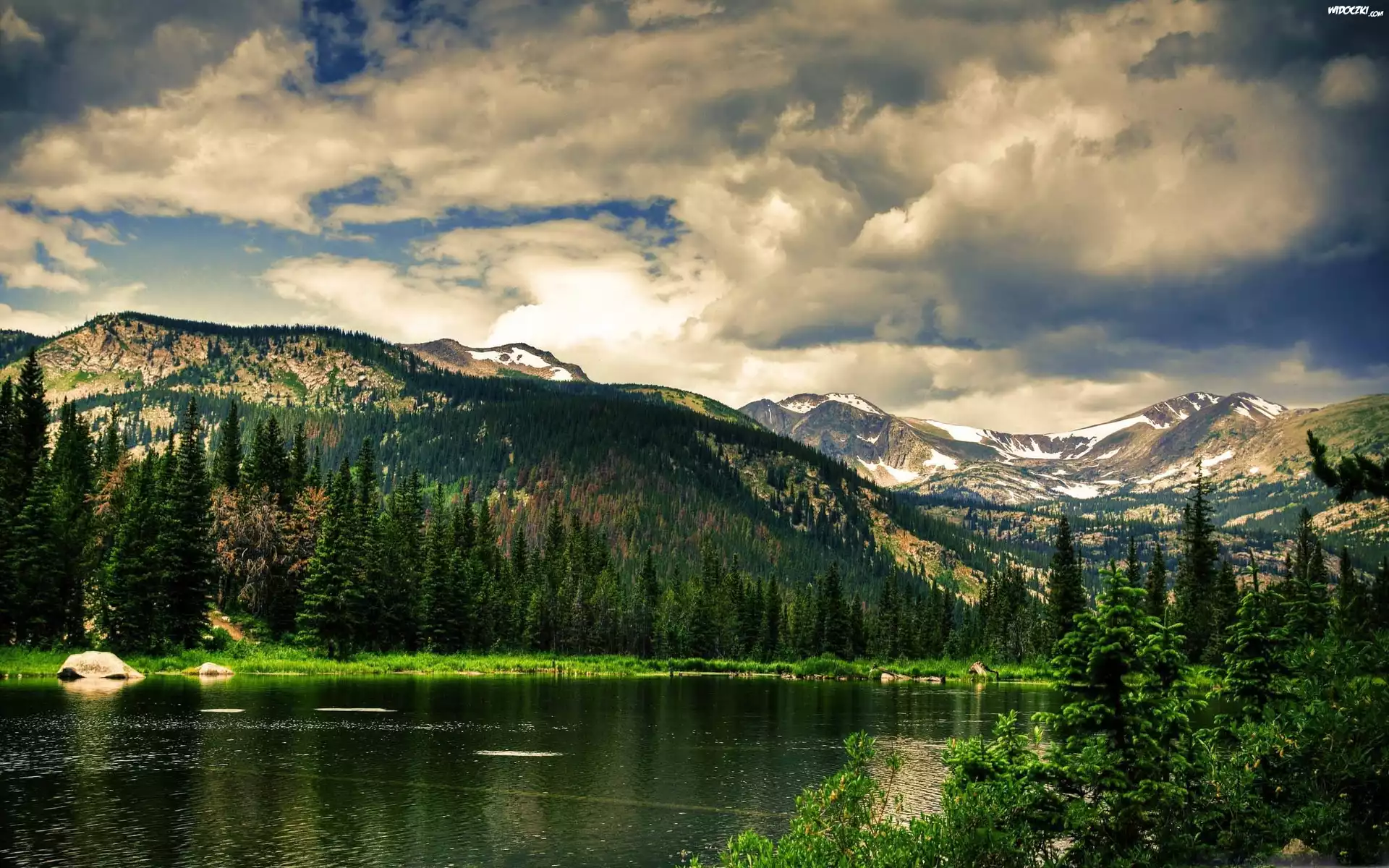 Zdjęcia, Góry, Jezioro, Świerki, Chmury