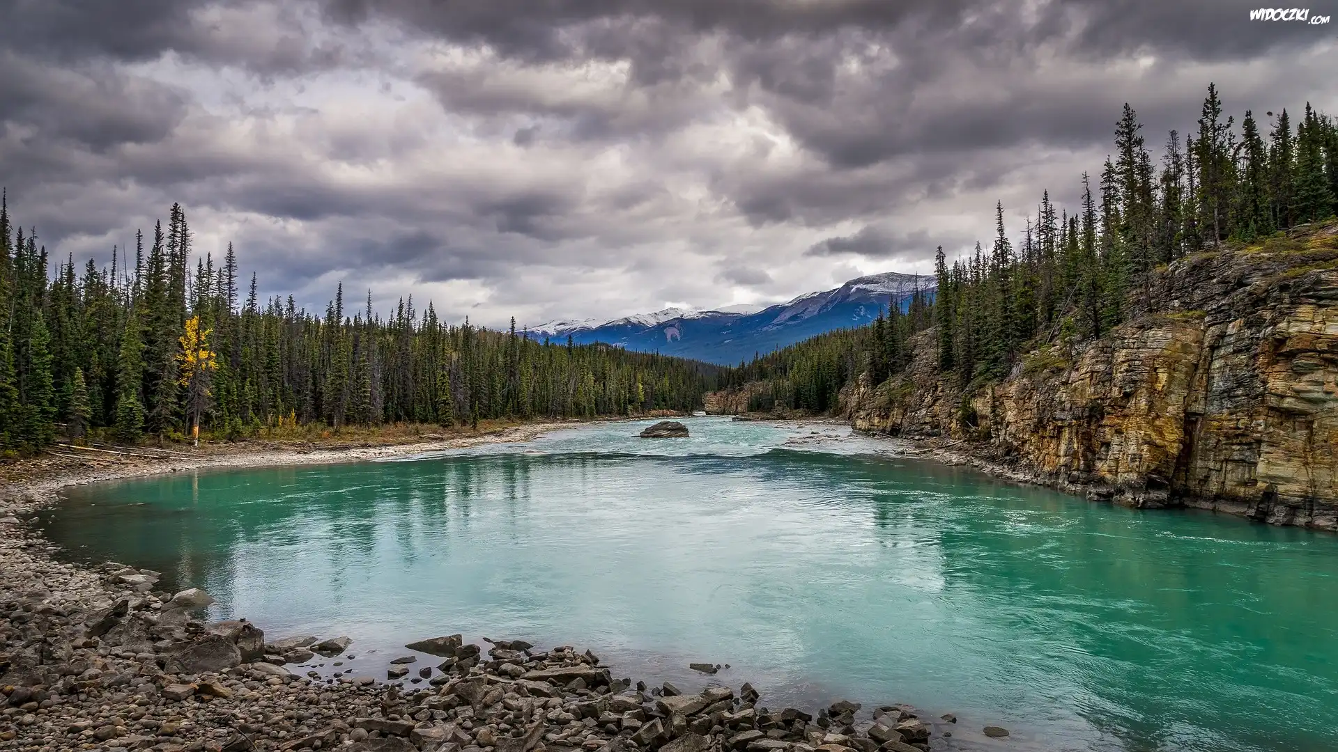 Zdjęcia, Rzeka Athabaskana, Góry, Skały, Świerki, Kamienie, Park Narodowy Jasper, Alberta, Kanada