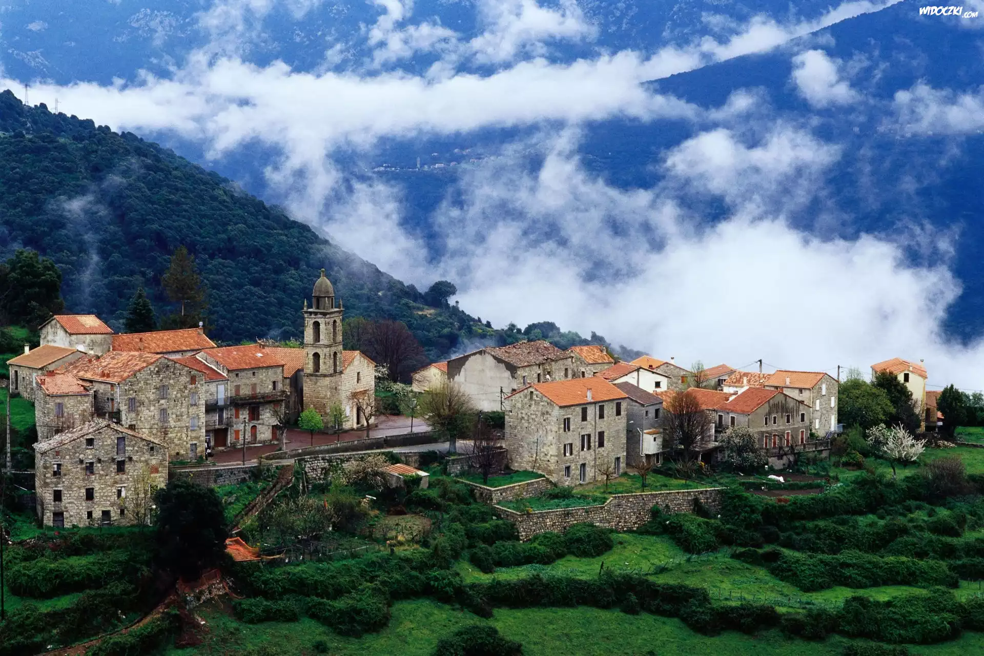 Zdjęcia, Góry, Chmury, Wioska, Budynki