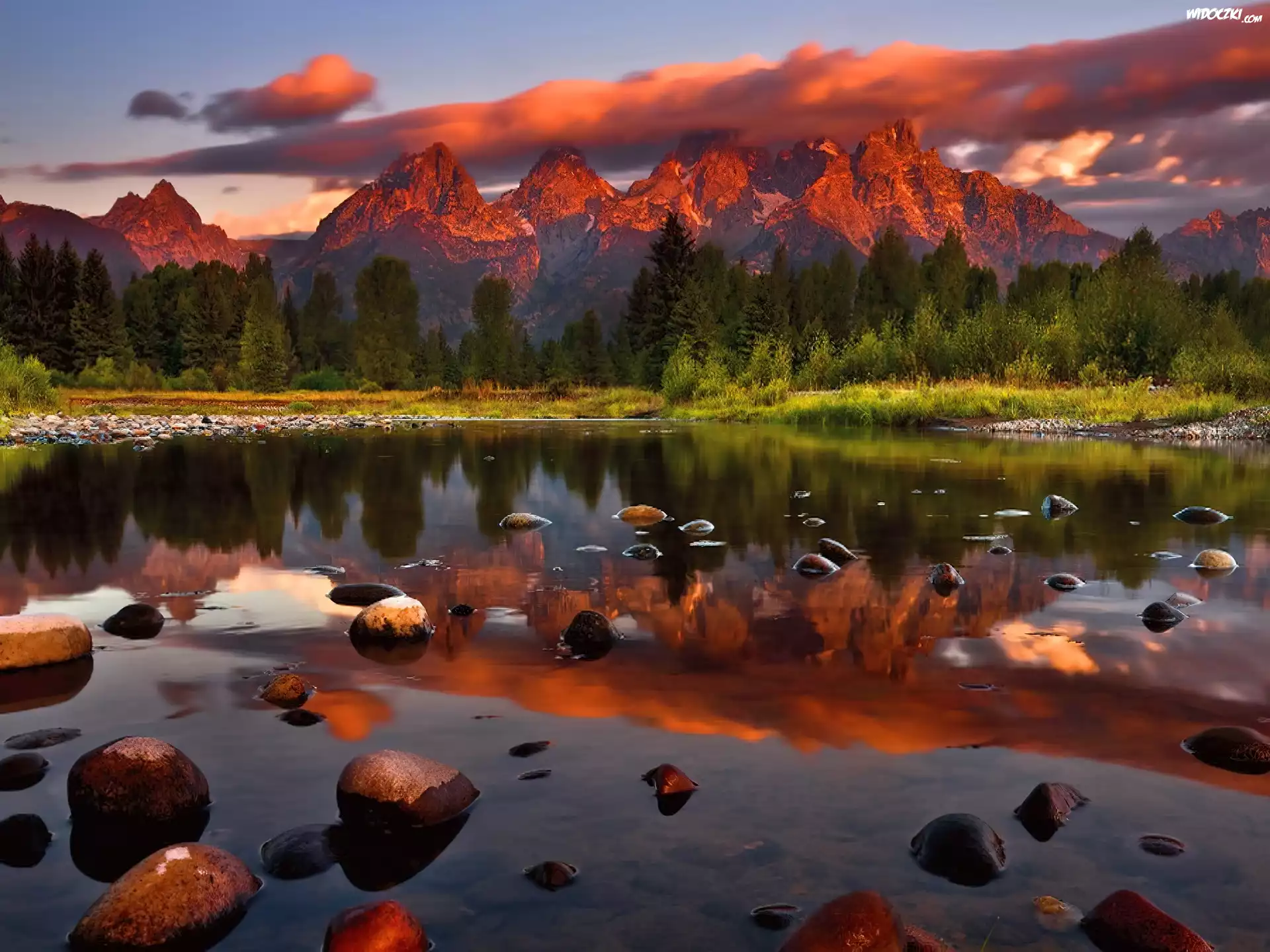 Zdjęcia, Góry, Niebo, Drzewa, Woda, Kamienie