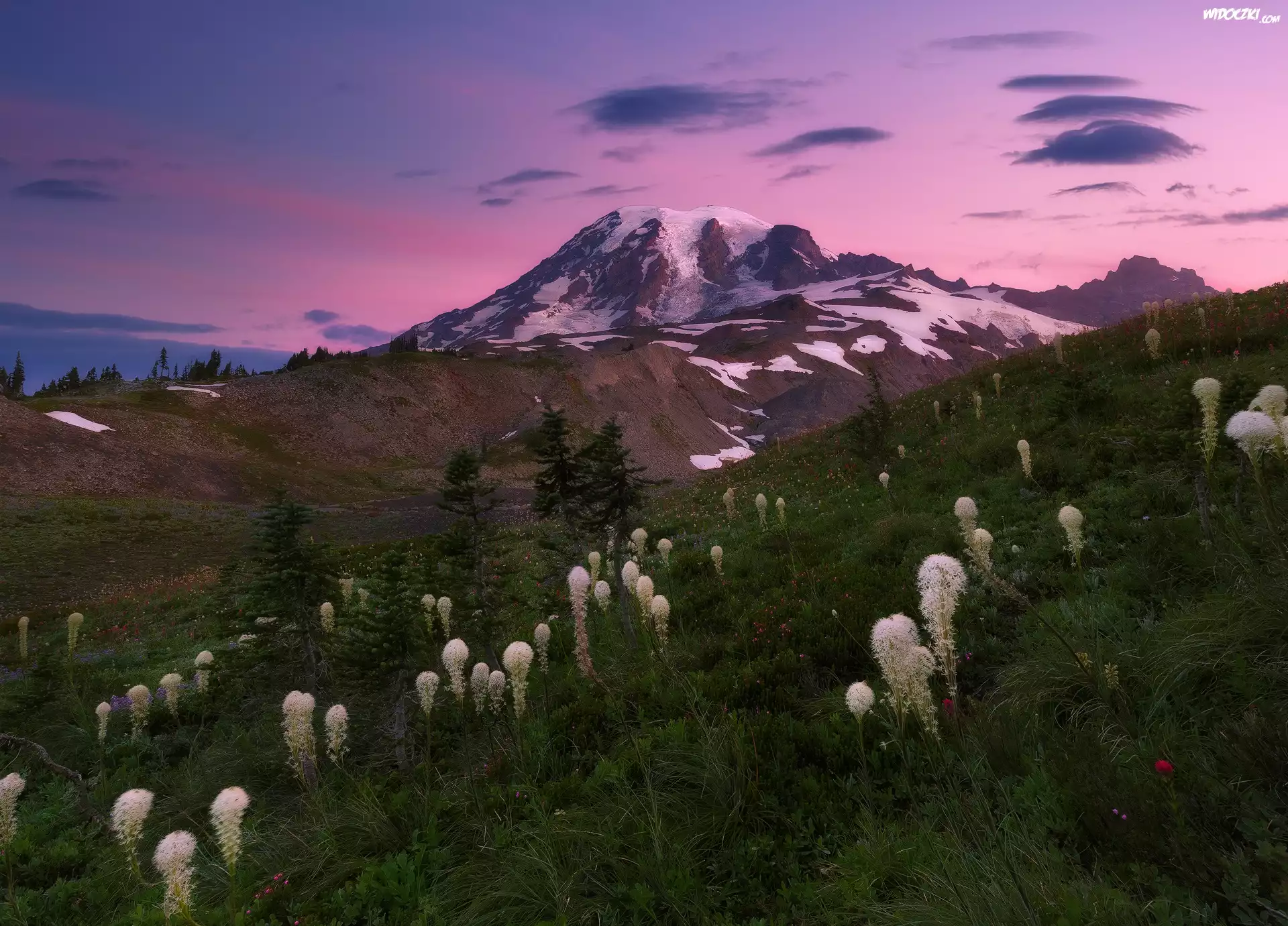 Góry, Łąka, Kwiaty, Wschód Słońca