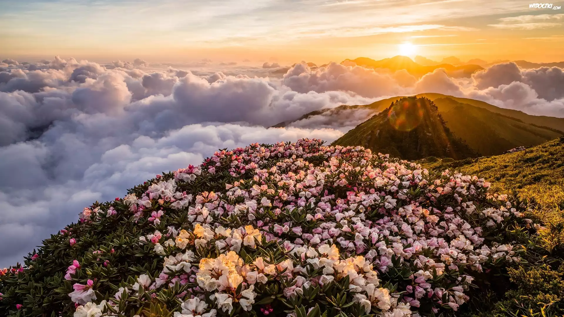 Góry, Kwiaty, Różanecznik, Chmury, Wschód słońca