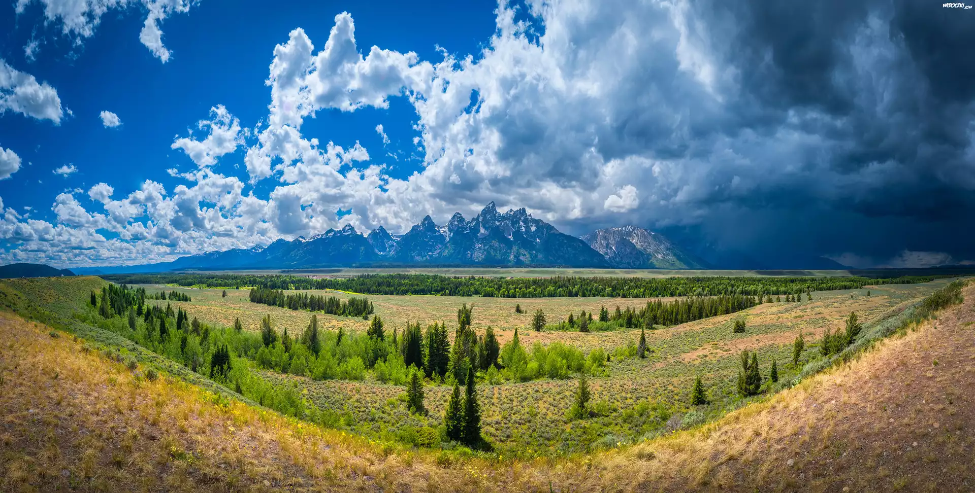 Stany Zjednoczone, Wyoming, Park Narodowy Grand Teton, Równina, Drzewa, Góry, Chmury, Niebo