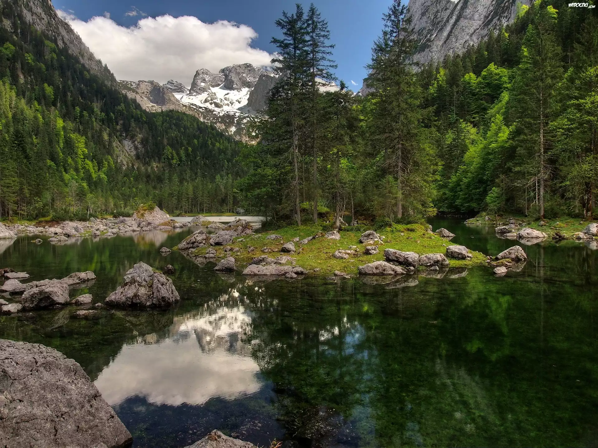 Góry, Jezioro, Drzewa, Wysepka, Kamienie