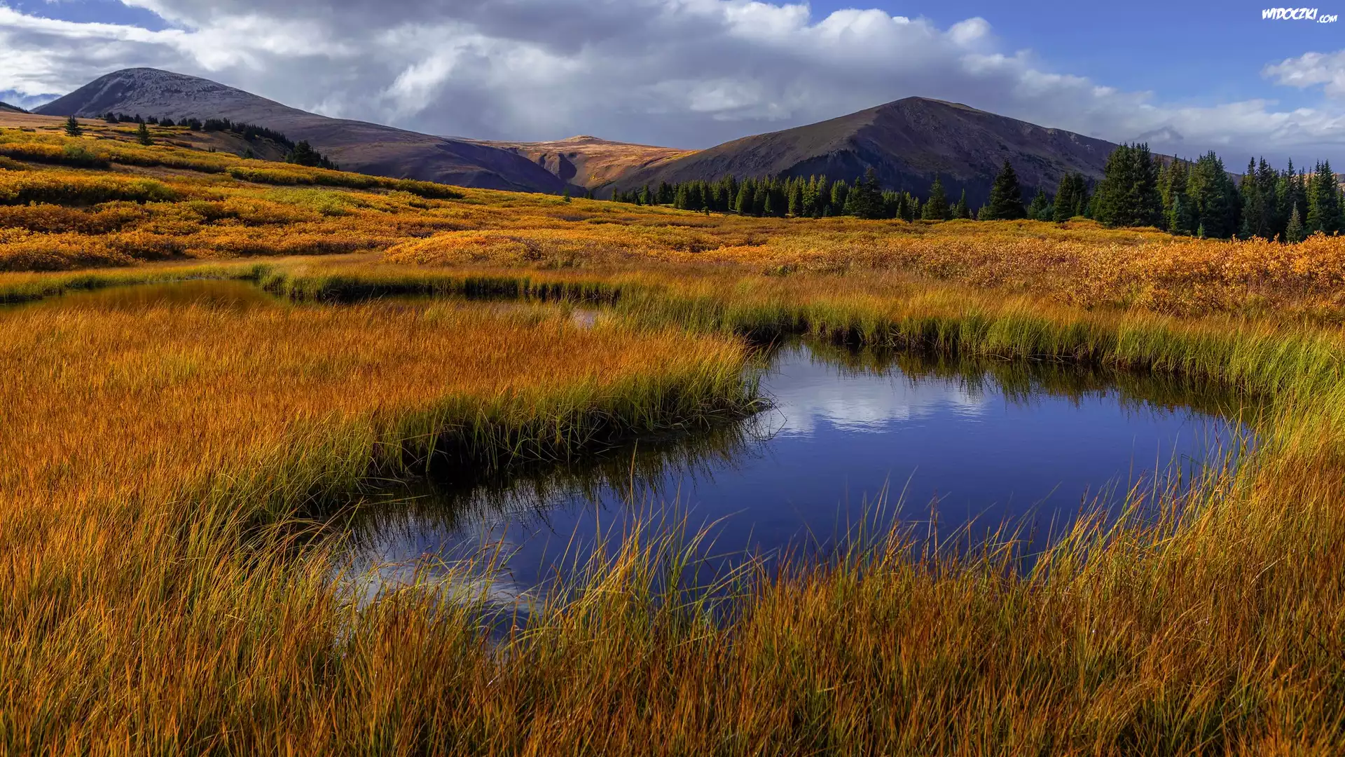 Zdjęcia, Polana, Łąki, Wzgórze, Góry, Staw, Sucha, Trawa