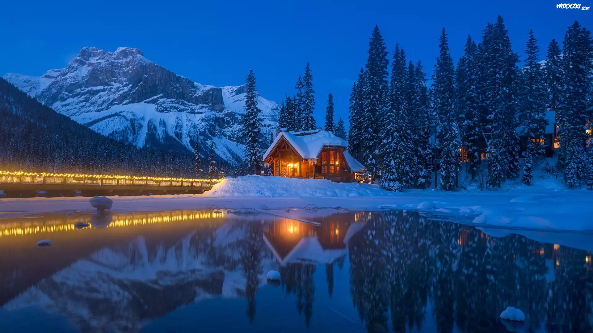 Kanada, Alberta, Park Narodowy Yoho, Jezioro, Emerald Lake, Góry, Dom, Most, Oświetlony, Zima, Drzewa |