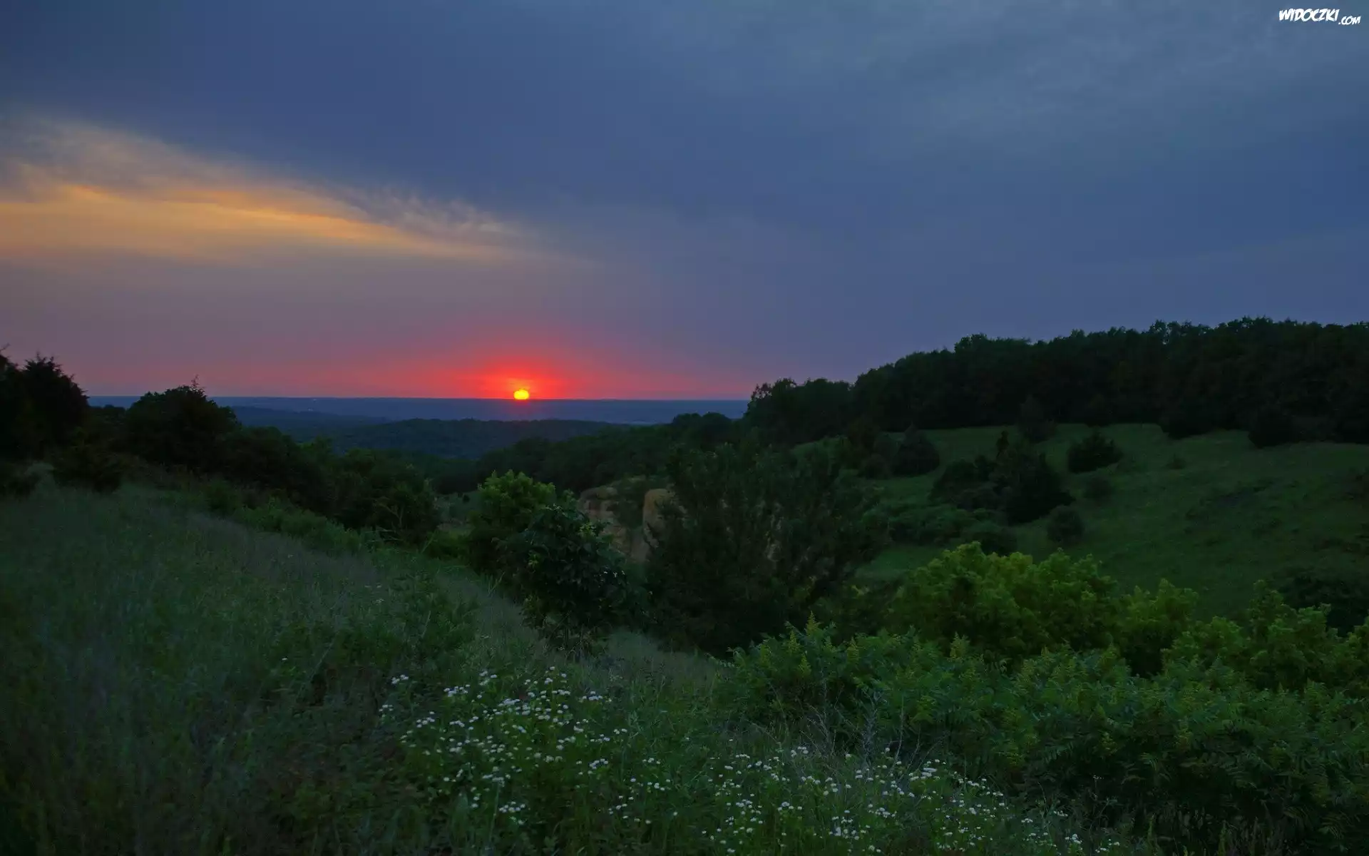 Zdjęcia, Góry, Lasy, Łąki, Kwiaty, Zachód, Słońca