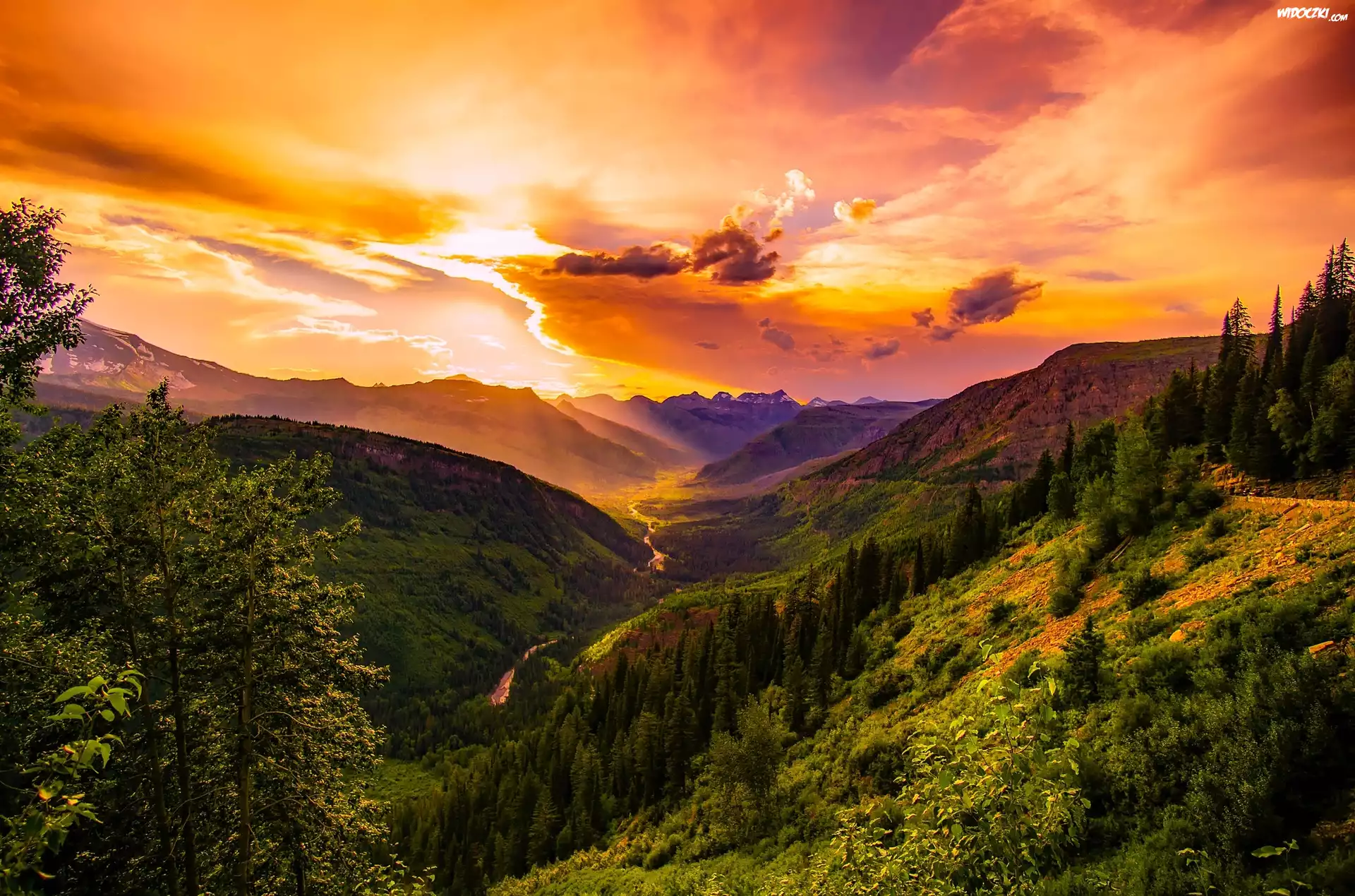 Zdjęcia, Góry, Rzeka, Dolina, Zachód słońca