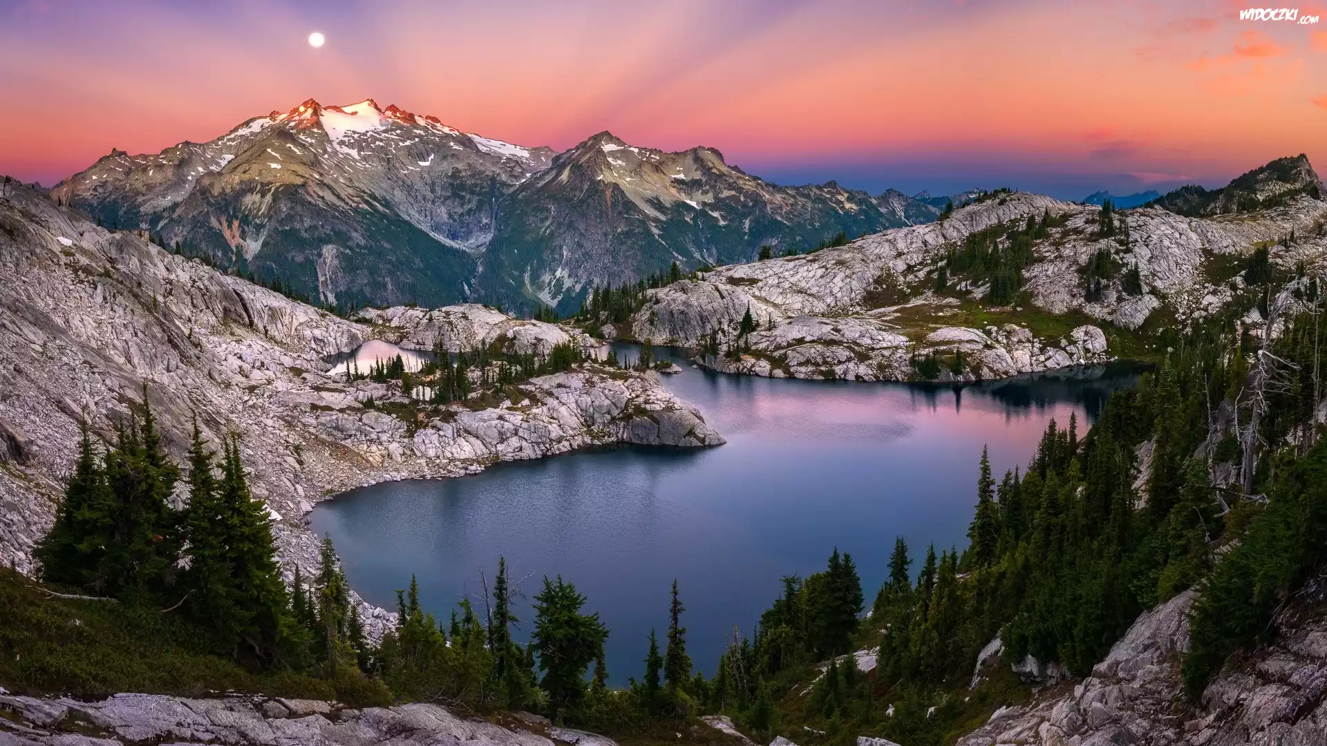 Zdjęcia, Góry, Jezioro, Drzewa, Księżyc, Zachód słońca