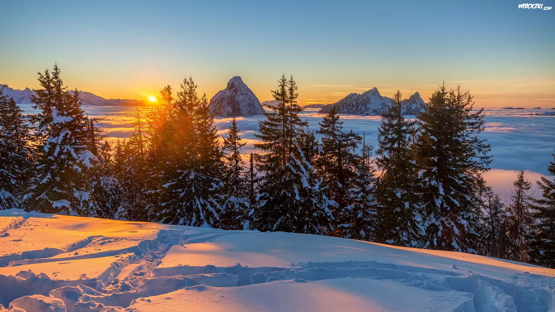 Zdjęcia, Góry, Zima, Drzewa, Zachód słońca
