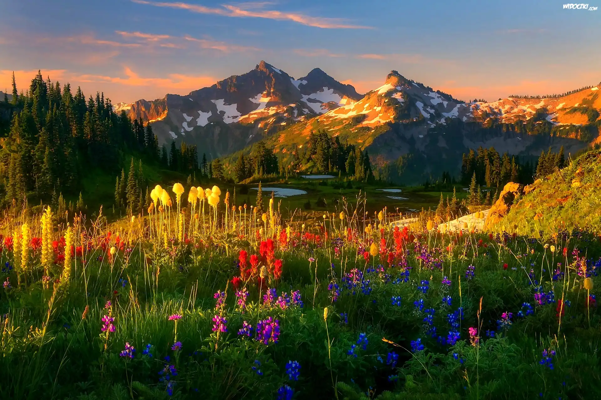 Góry, Kwiaty, Kolorowa, Łąka, Zachód Słońca