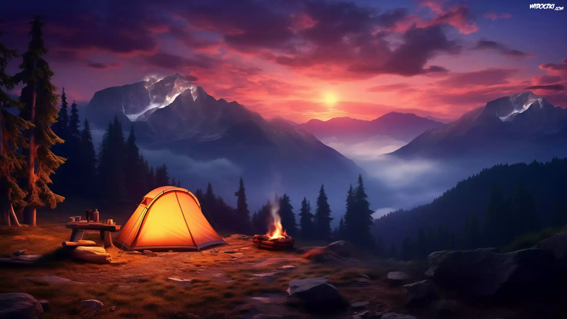 Zdjęcia, Góry, Drzewa, Namiot, Ognisko, Stolik, Niebo, Zachód słońca, 2D