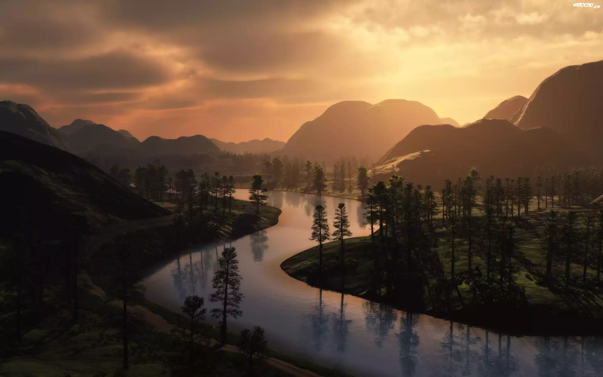 Góry, Rzeka, Zachód, Słońca