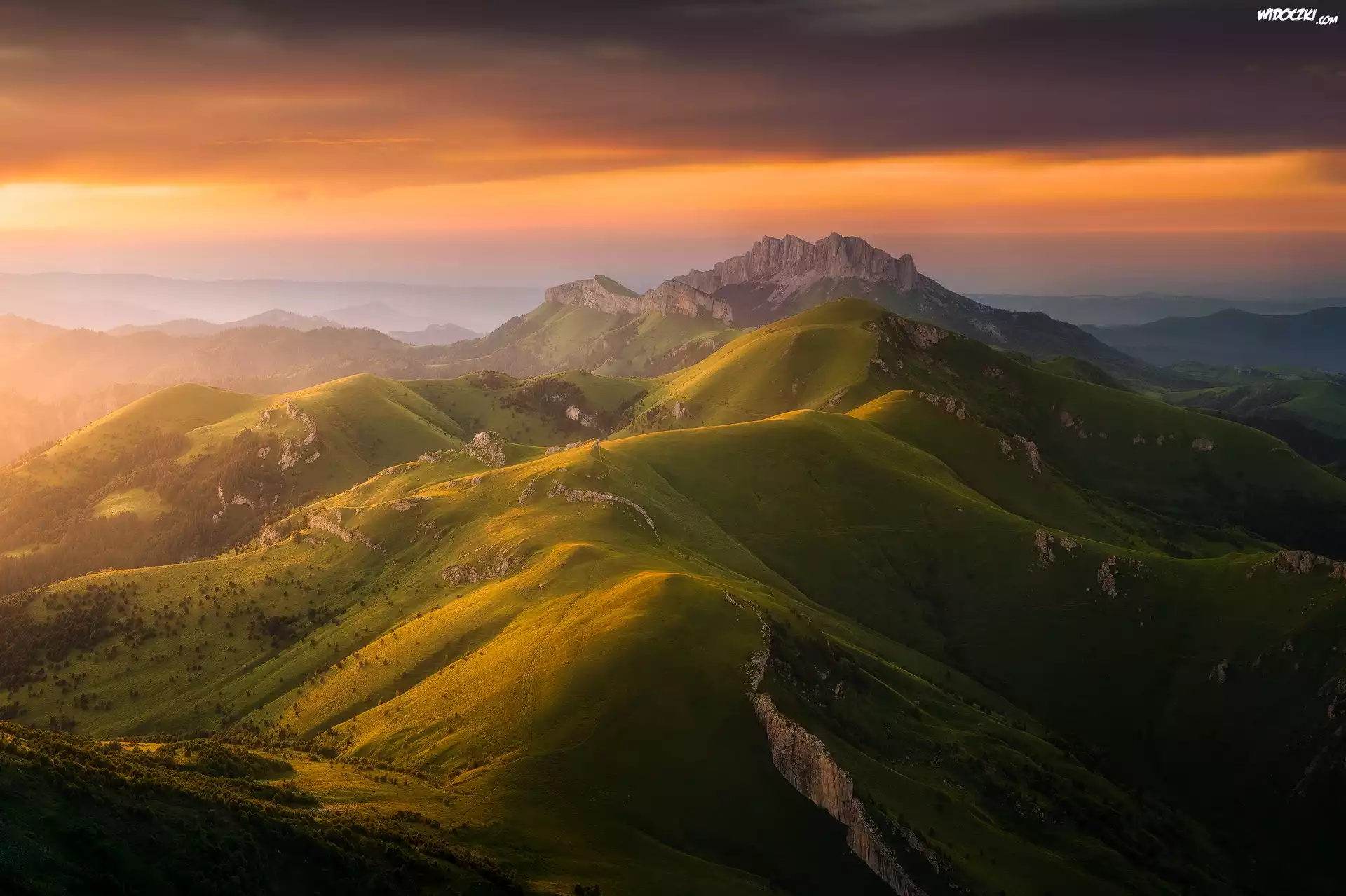 Zdjęcia, Góry, Zielone, Wzgórza, Zachód słońca