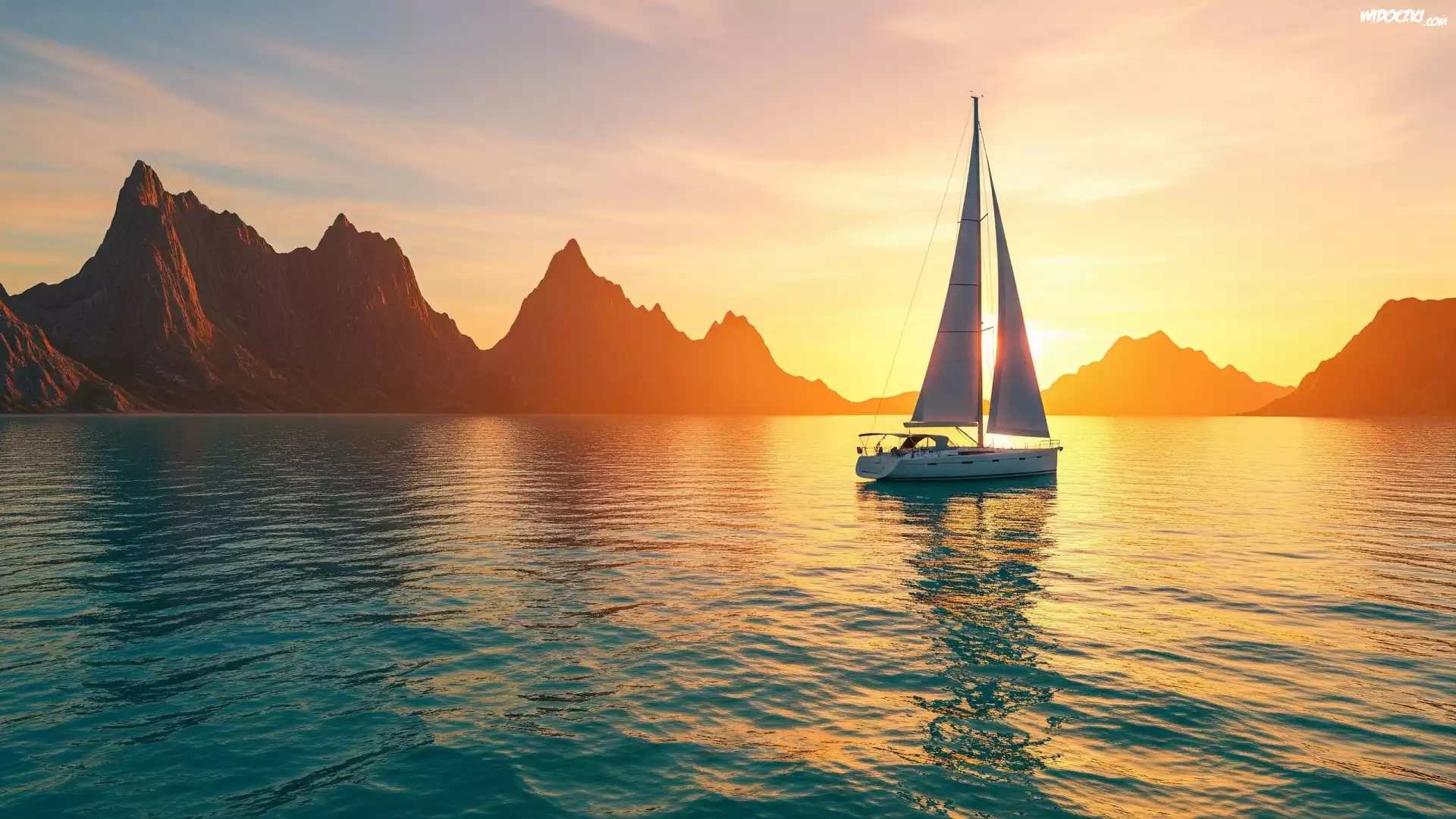 Zdjęcia, Morze, Góry, Żaglówka, Zachód Słońca