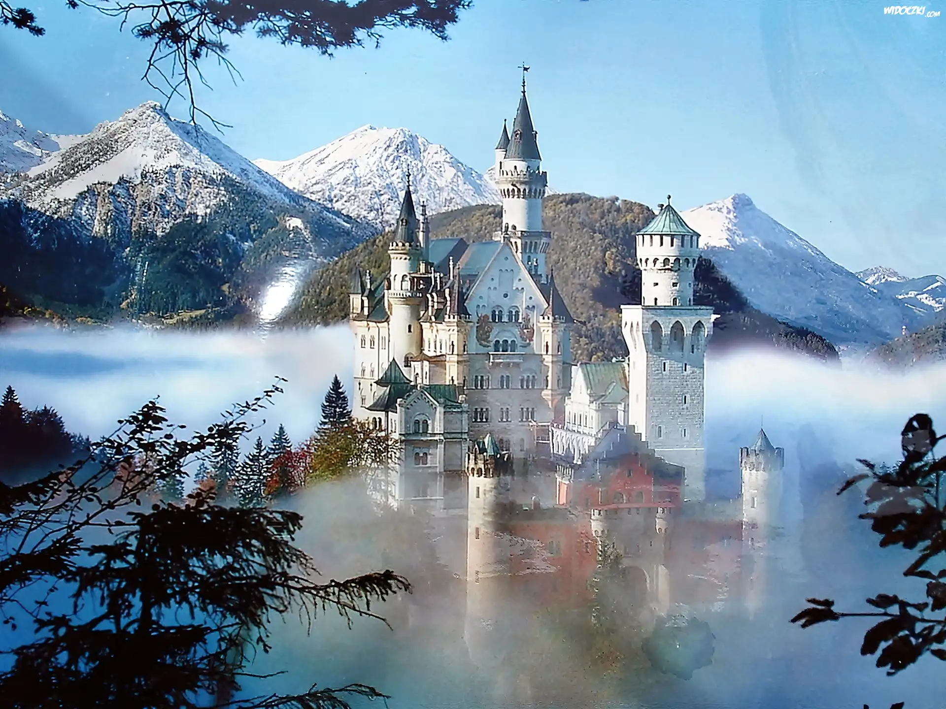 Zdjęcia, Góry, Mgła, Drzewa, Zamek, Neuschwanstein