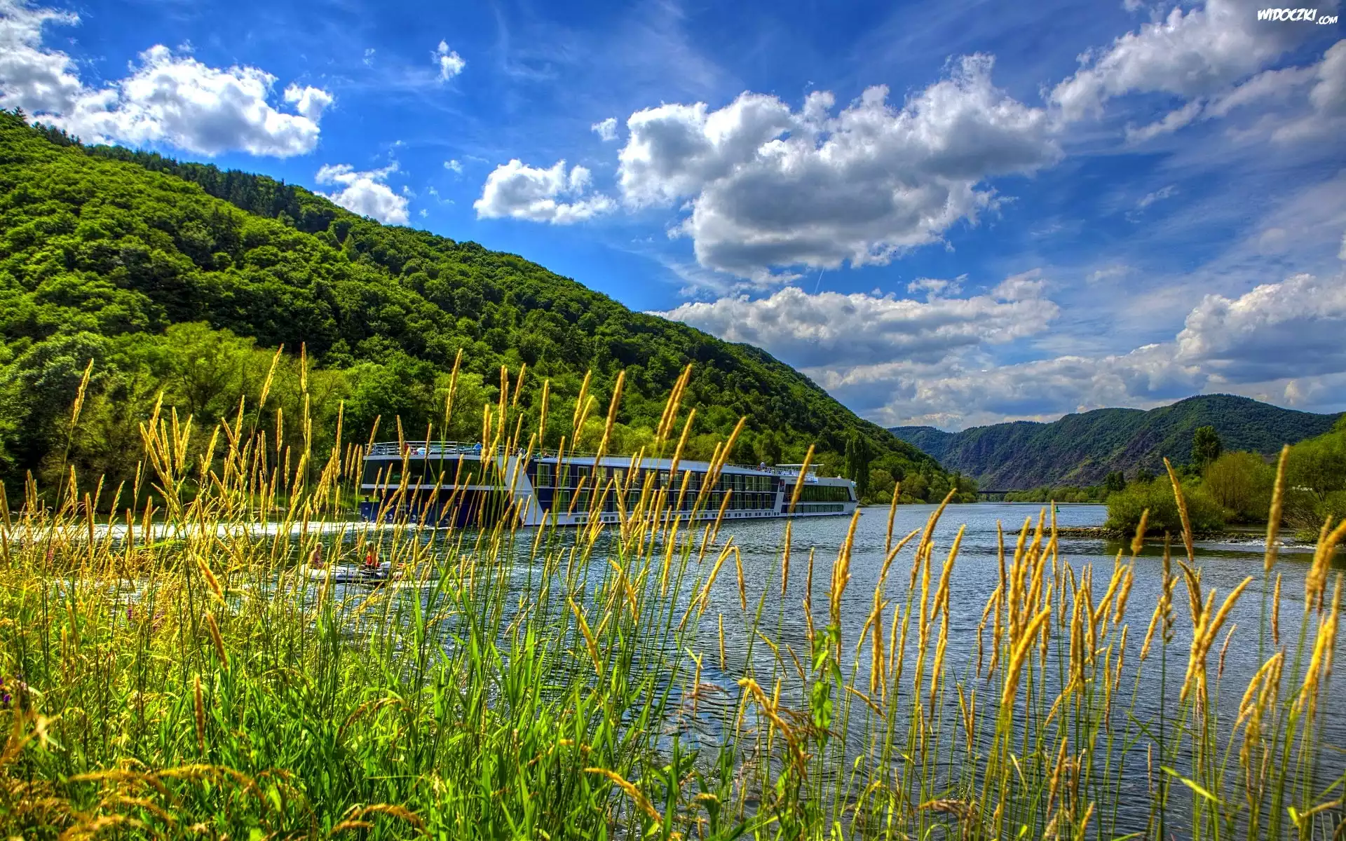 Zdjęcia, Góry, Rzeka, Statek Wycieczkowy, Zarośla, Lato