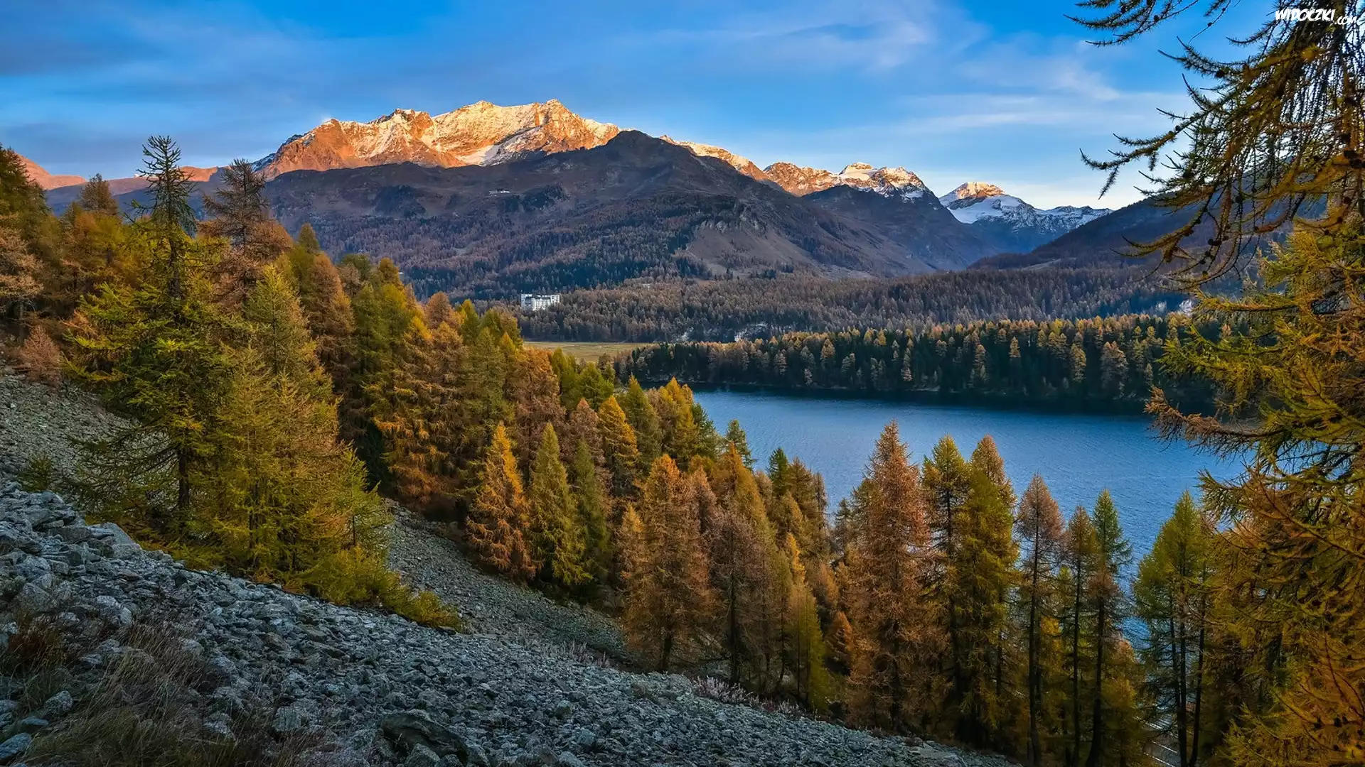 Zdjęcia, Góry, Jezioro, Drzewa, Zbocze, Kamienie