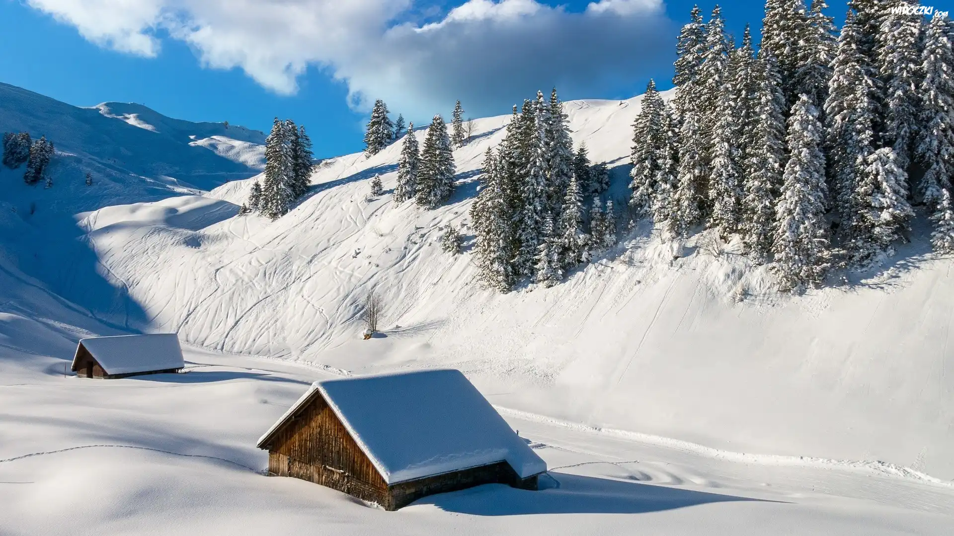 Zdjęcia, Zima, Góry, Śnieg, Drzewa, Drewniane, Szopy, Domki