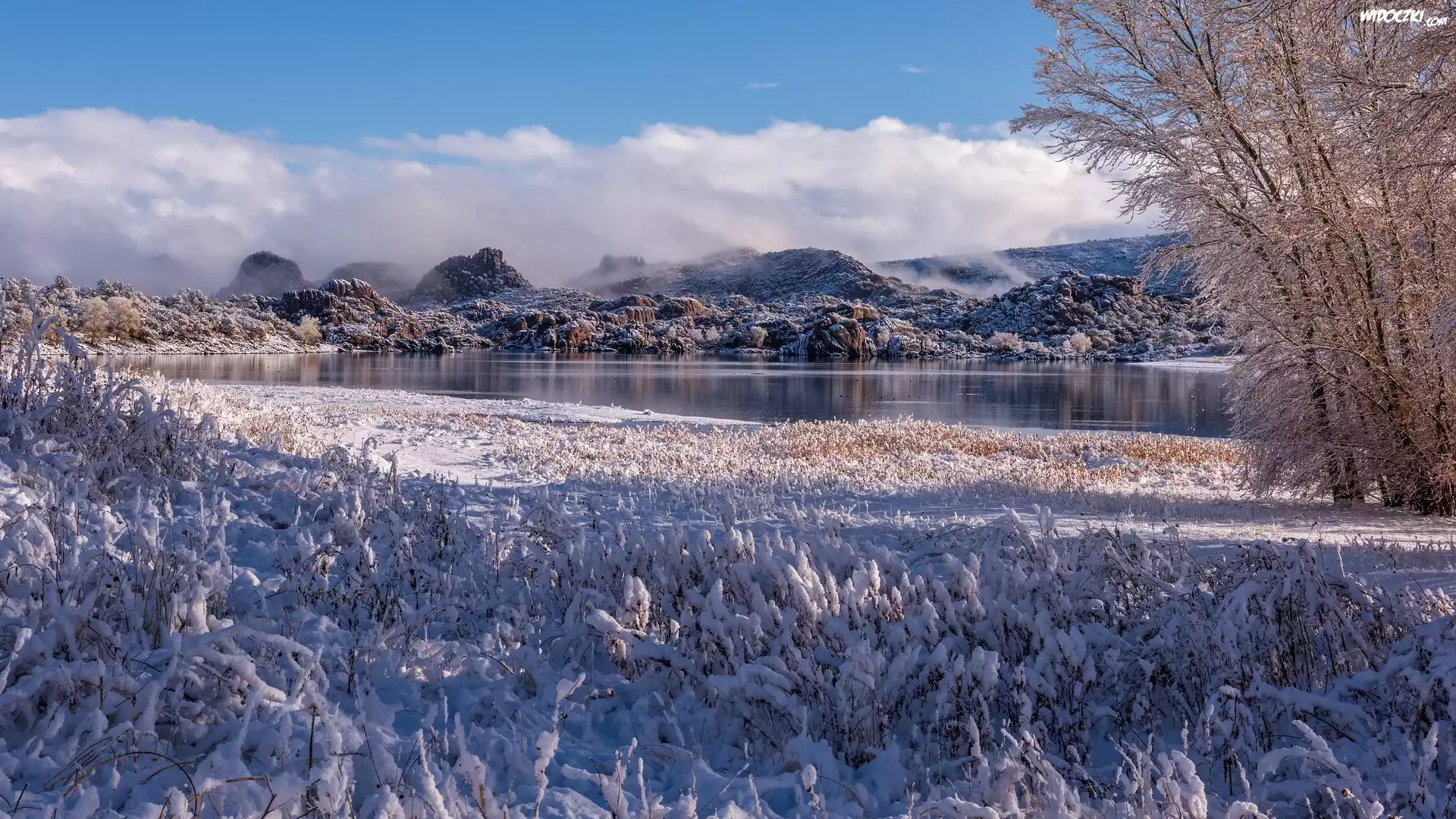 Zima, Góry, Skały, Jezioro, Ośnieżone, Rośliny, Drzewa