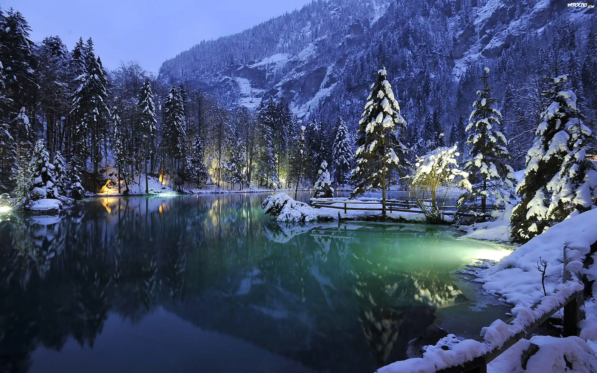 Zima, Góry, Lasy, Drzewa, Jezioro Blausee, Szwajcaria