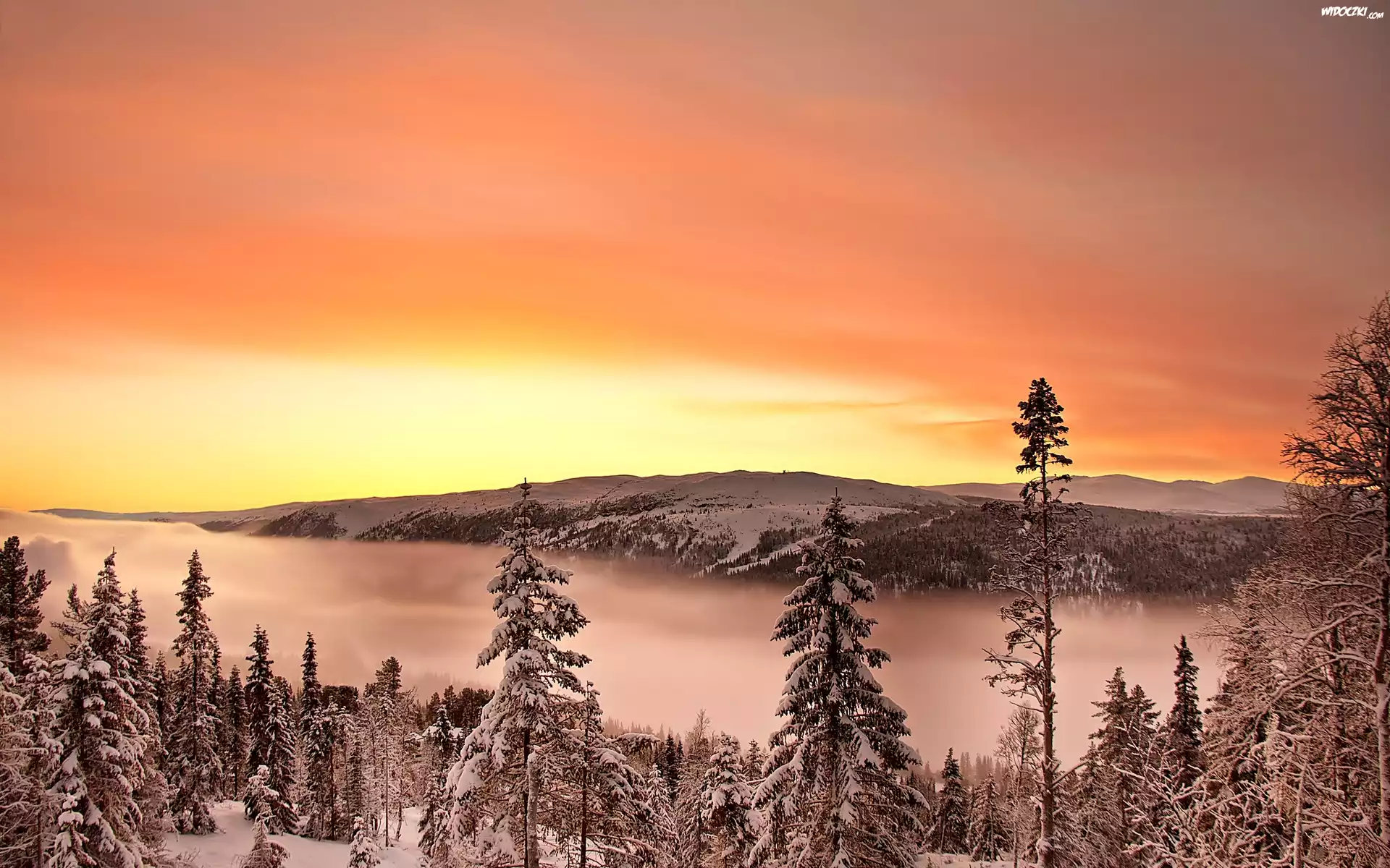 Zima, Góry, Mgła, Zachód, Słońca, Ośnieżone, Świerki