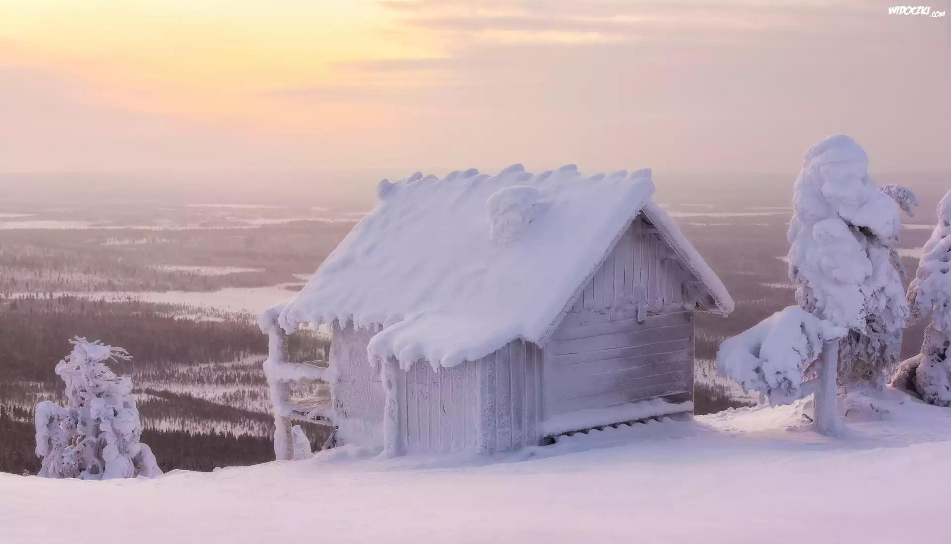 Zdjęcia, Zima, Góry, Ośnieżony, Drewniany, Dom, Drzewa, Wzgórze