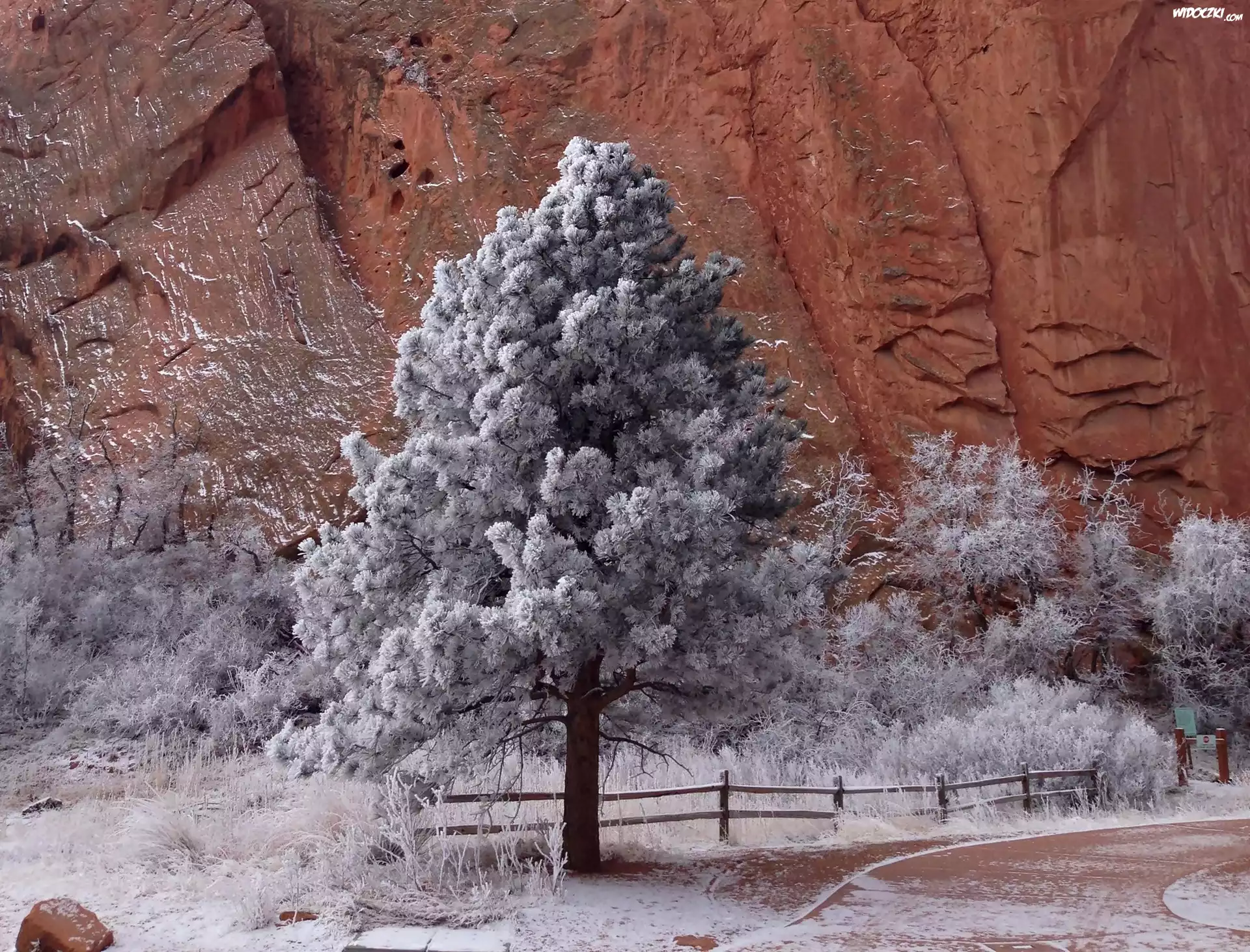 Zdjęcia, Góry, Skały, Droga, Zmrożone, Drzewa