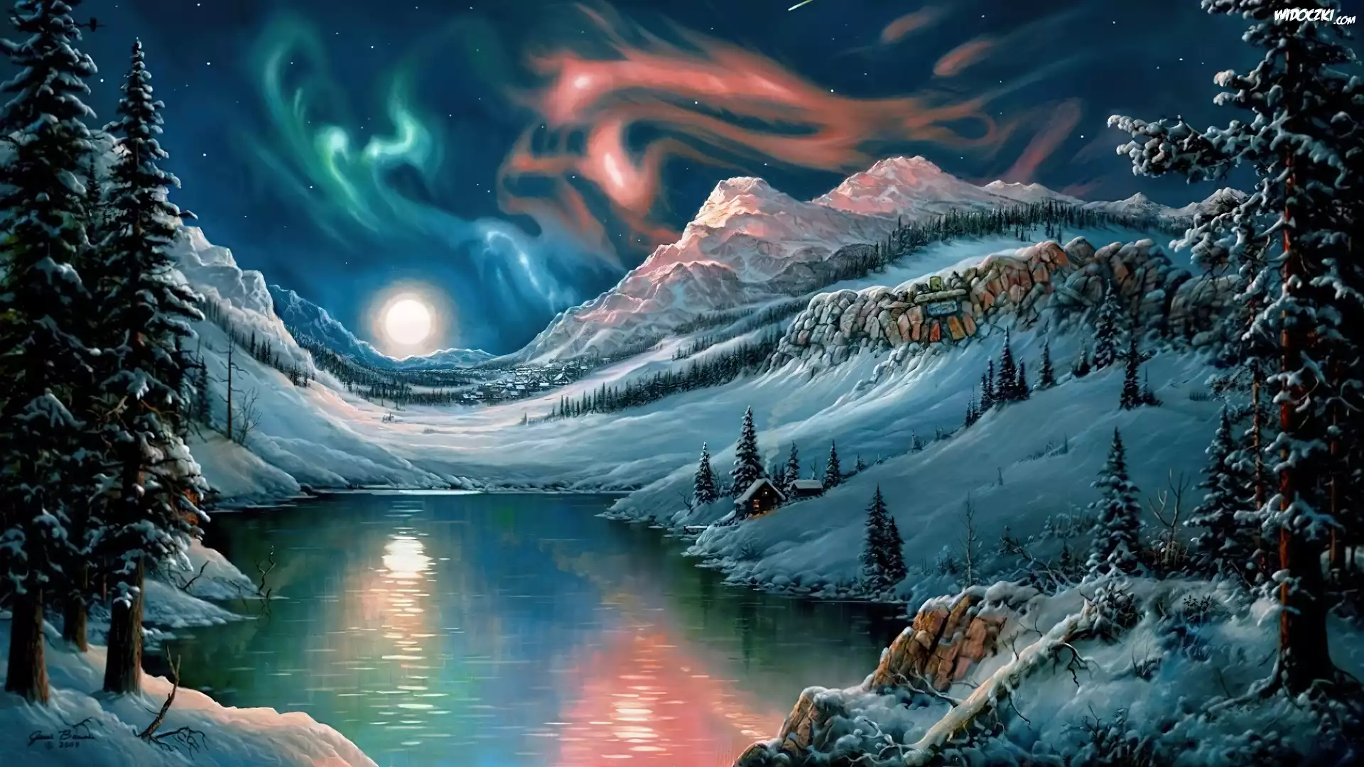 Zdjęcia, Góry, Jezioro, Zima, Zorza Polarna