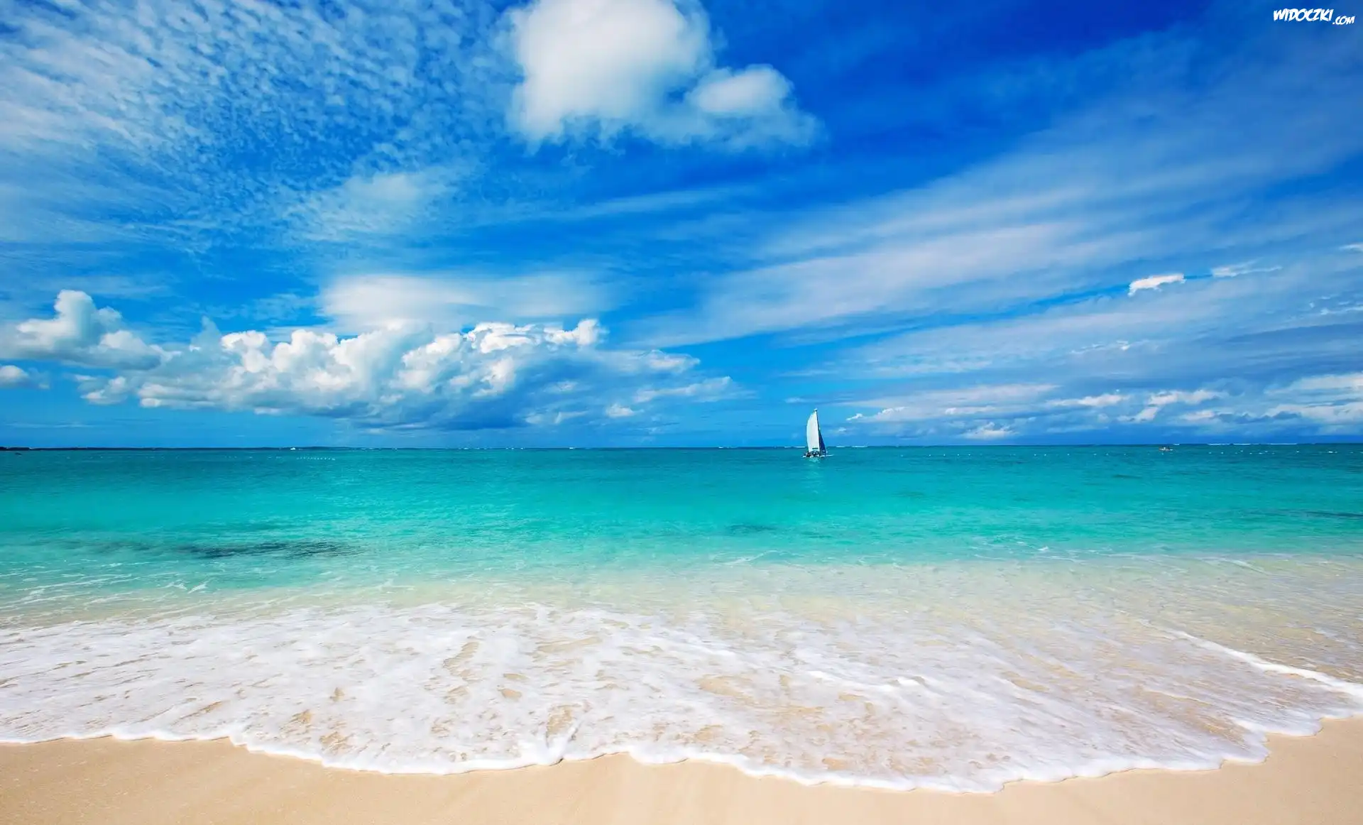 Zdjęcia, Bahamy, Turks i Caicos, Plaża Grace Bay Beach, Morze, Niebo, Plaża, Żaglówka