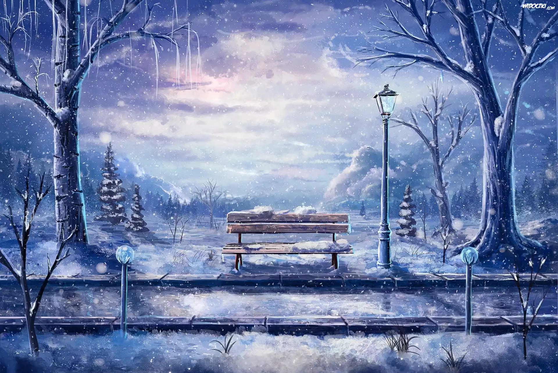 Grafika, Park, Zima, Ławka, Ławeczka, Lampy