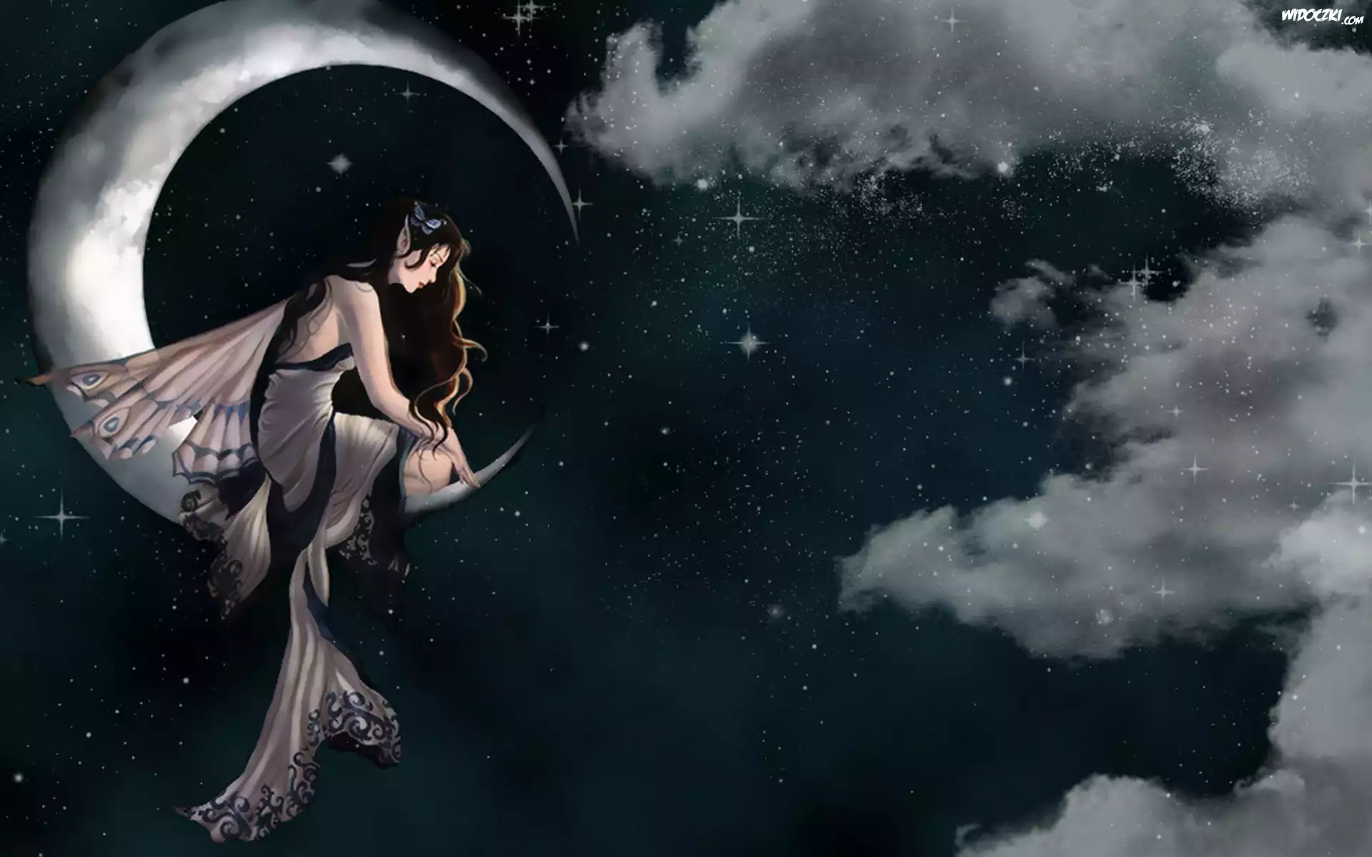 Zdjęcia, Grafika, Kobieta, Księżyc, Chmury, Gwiazdki