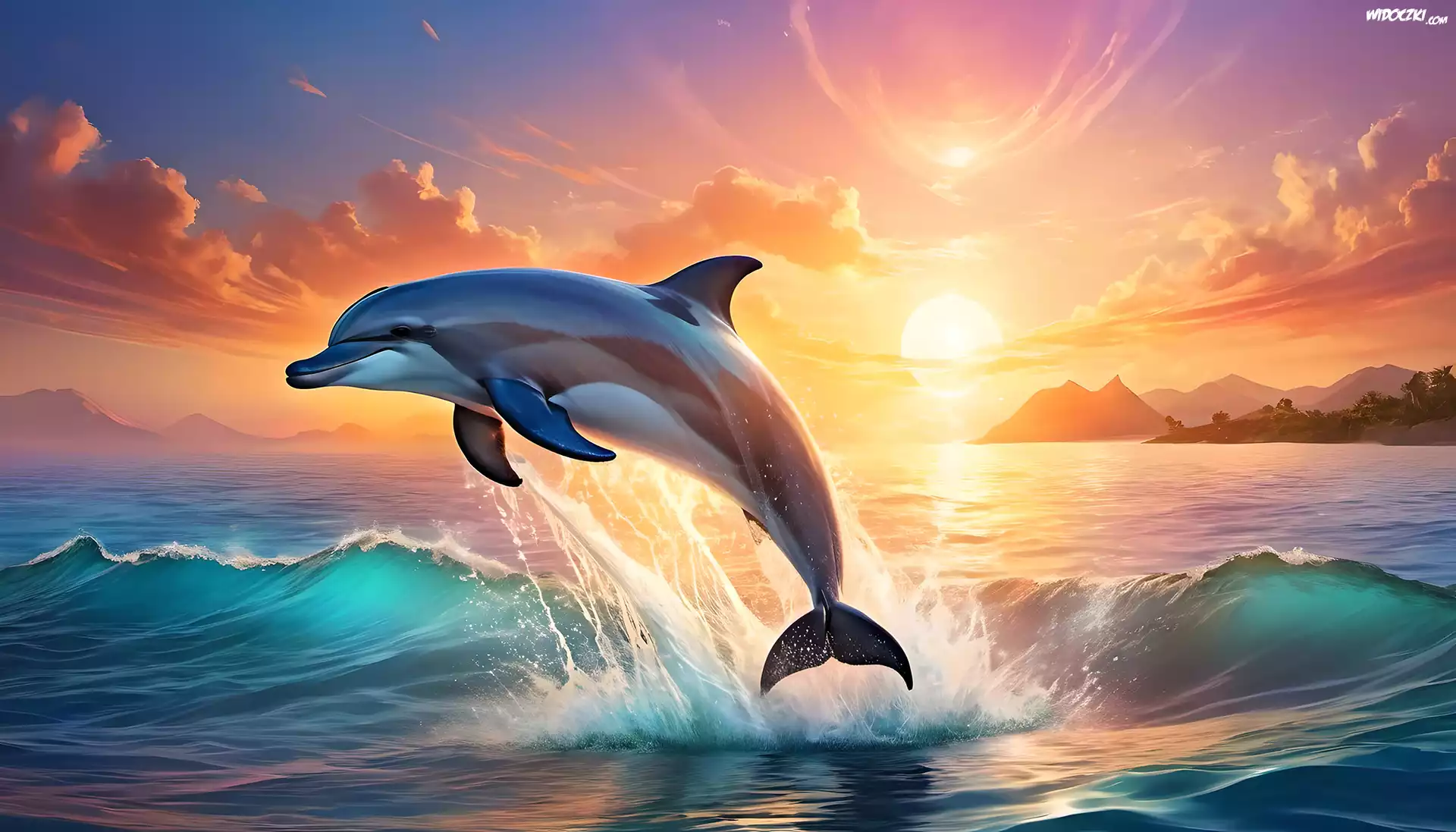 Delfin, Niebo, Chmury, Grafika, Zachód słońca, Morze
