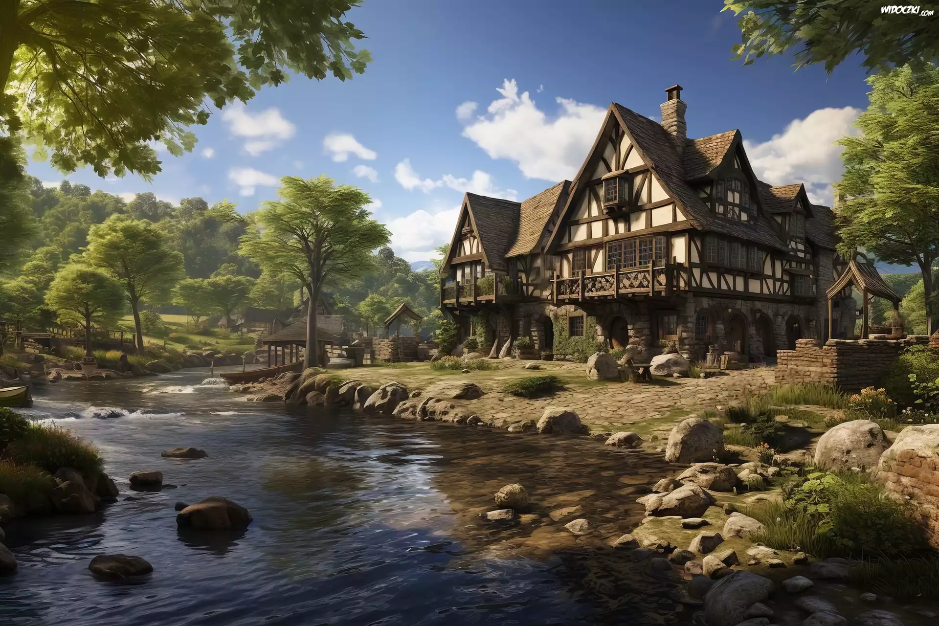 Dom, Drzewa, Rzeka, Grafika