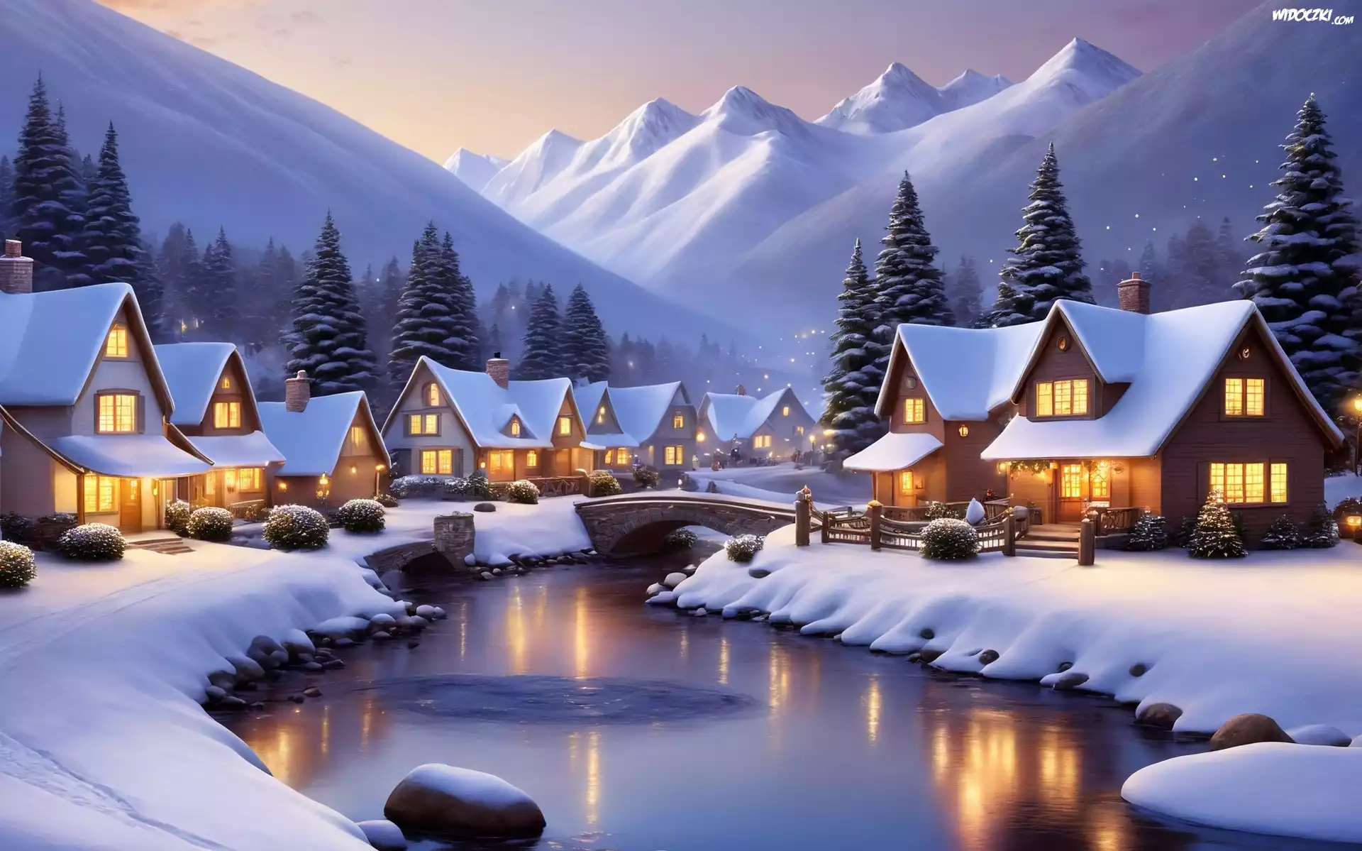 Zdjęcia, Zima, Góry, Domy, Światła, Rzeka, Mostek, Drzewa, Grafika
