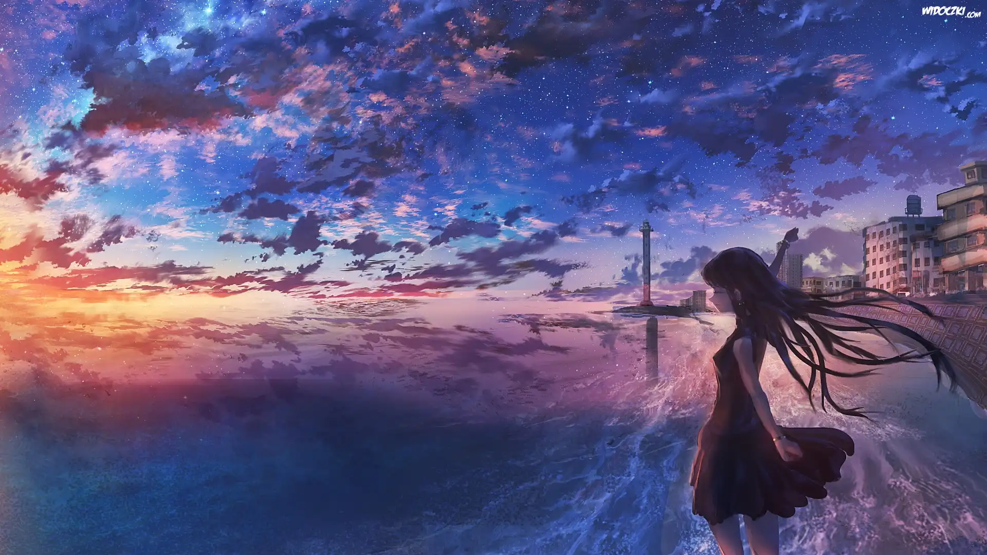 Grafika, Dziewczyna, Morze, Chmury, Domy Paintography