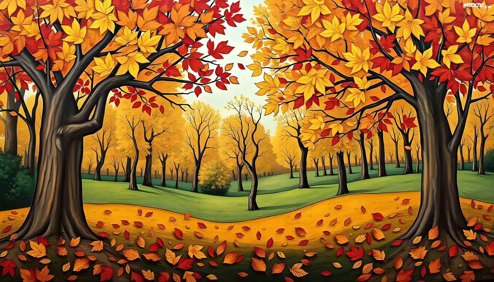 Drzewa, Liście, Jesień, Grafika