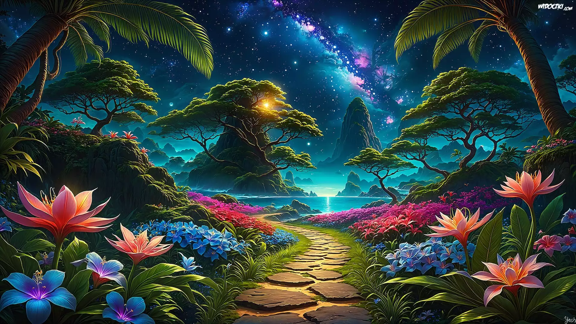 Grafika, Ścieżka, Kamienna, Niebo, Droga Mleczna, Drzewa, Palmy, Kwiaty