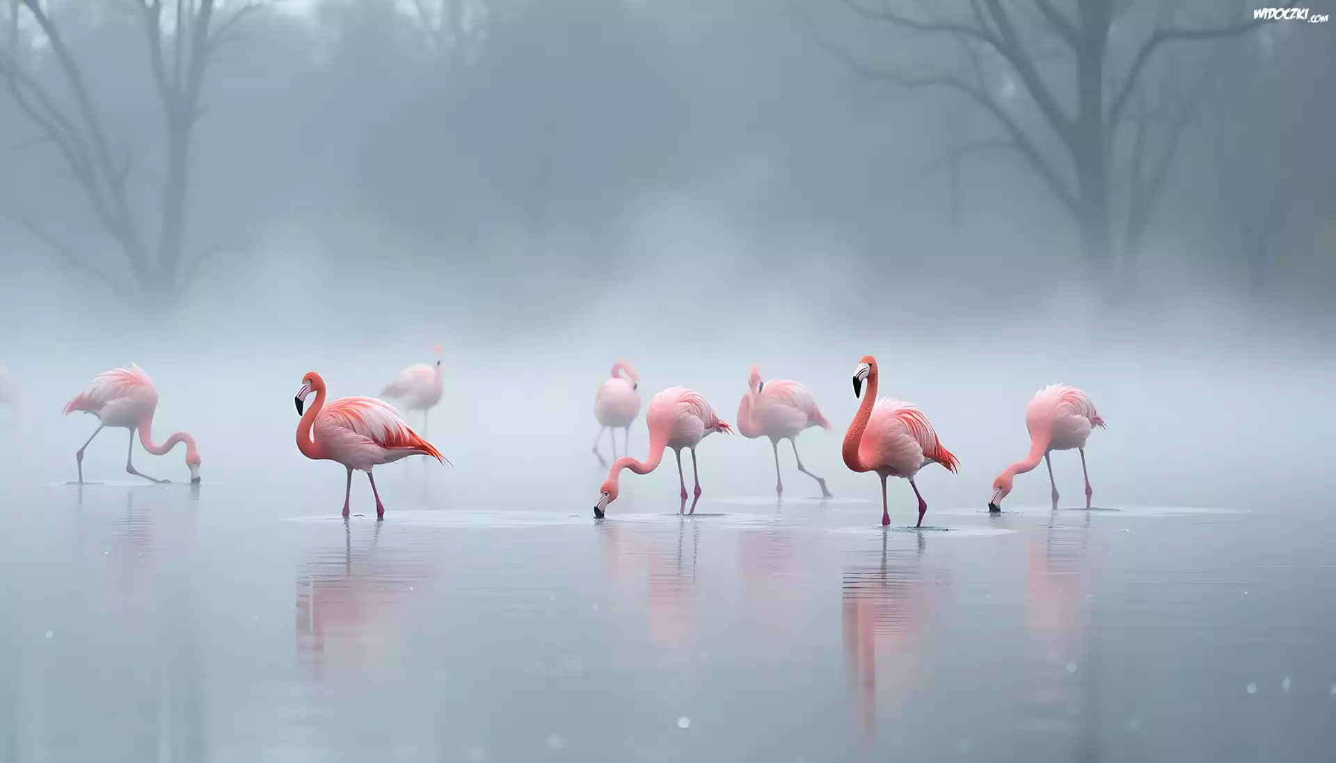 Flamingi, Ptaki, Mgła, Grafika
