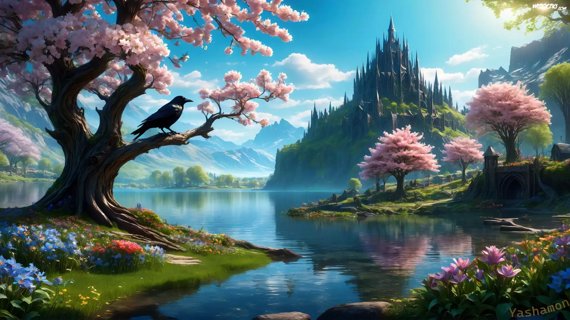 Góry, Wieże, Jezioro, Różowe, Drzewa, Ptak, Kwiaty, Grafika