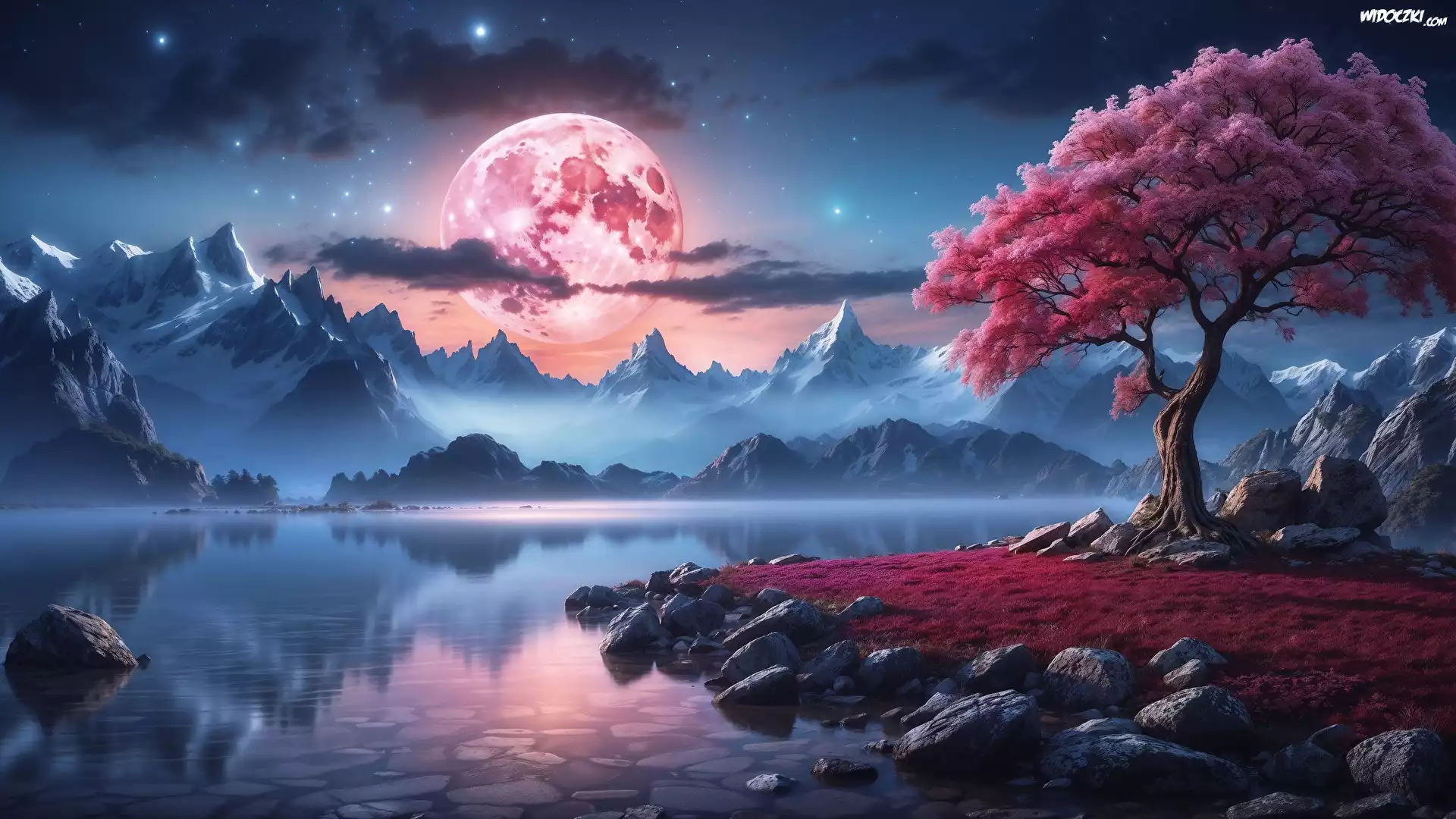 Góry, Jezioro, Mgła, Kamienie, Drzewo, Noc, Księżyc, Grafika