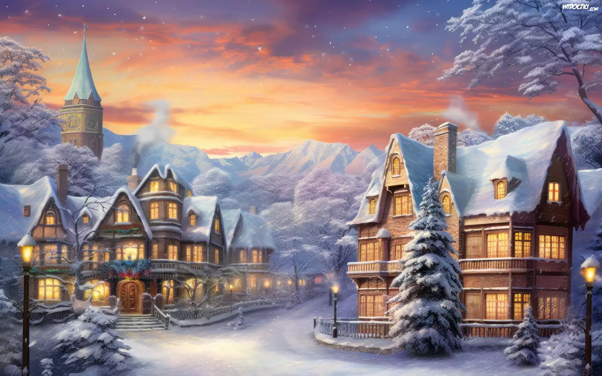 Zdjęcia, Zima, Góry, Miasteczko, Domy, Droga, Drzewa, Latarnie, Grafika