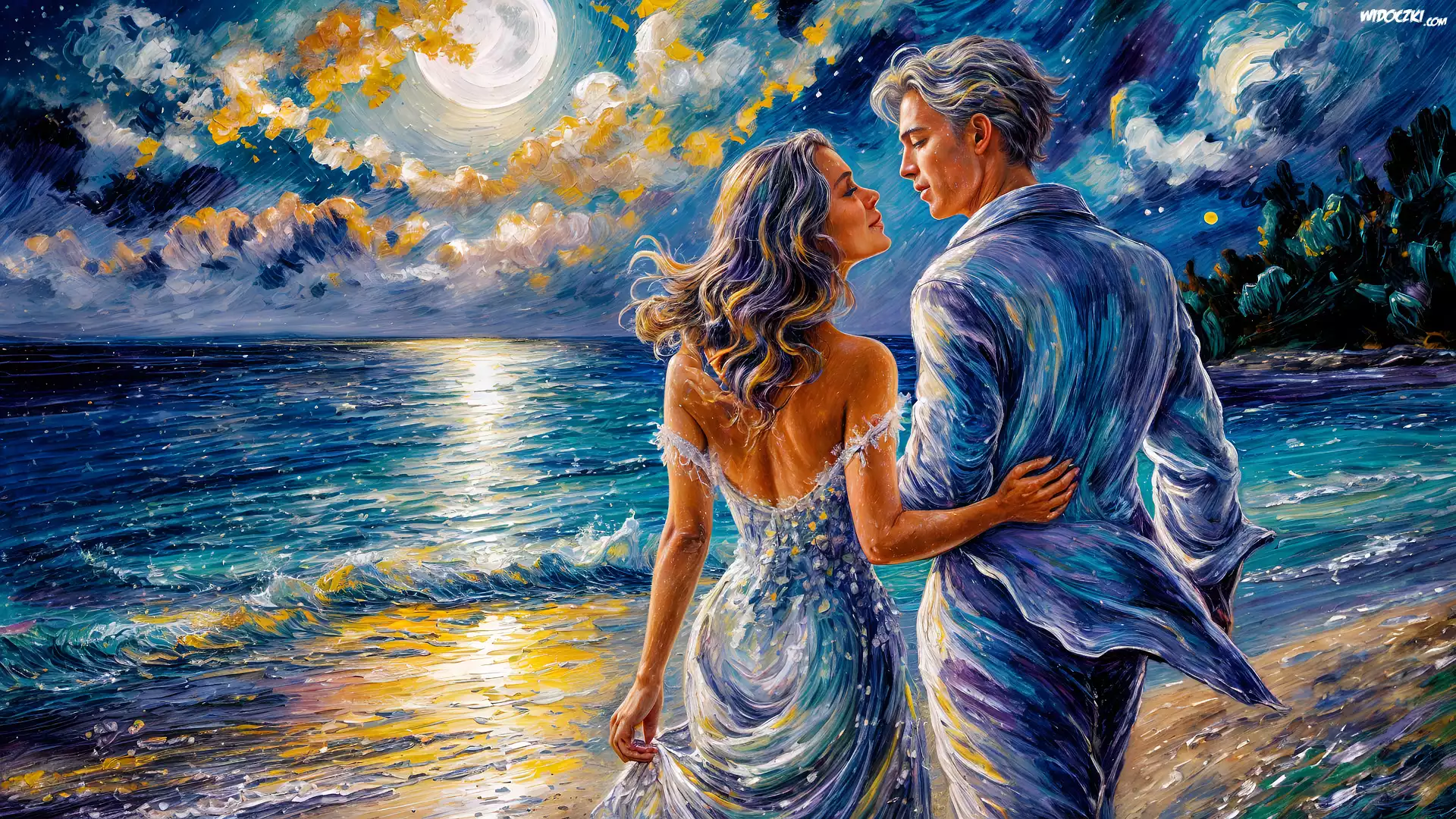 Zdjęcia, Para, Zakochani, Morze, Księżyc, Grafika, Kobieta, Mężczyzna, Grafika