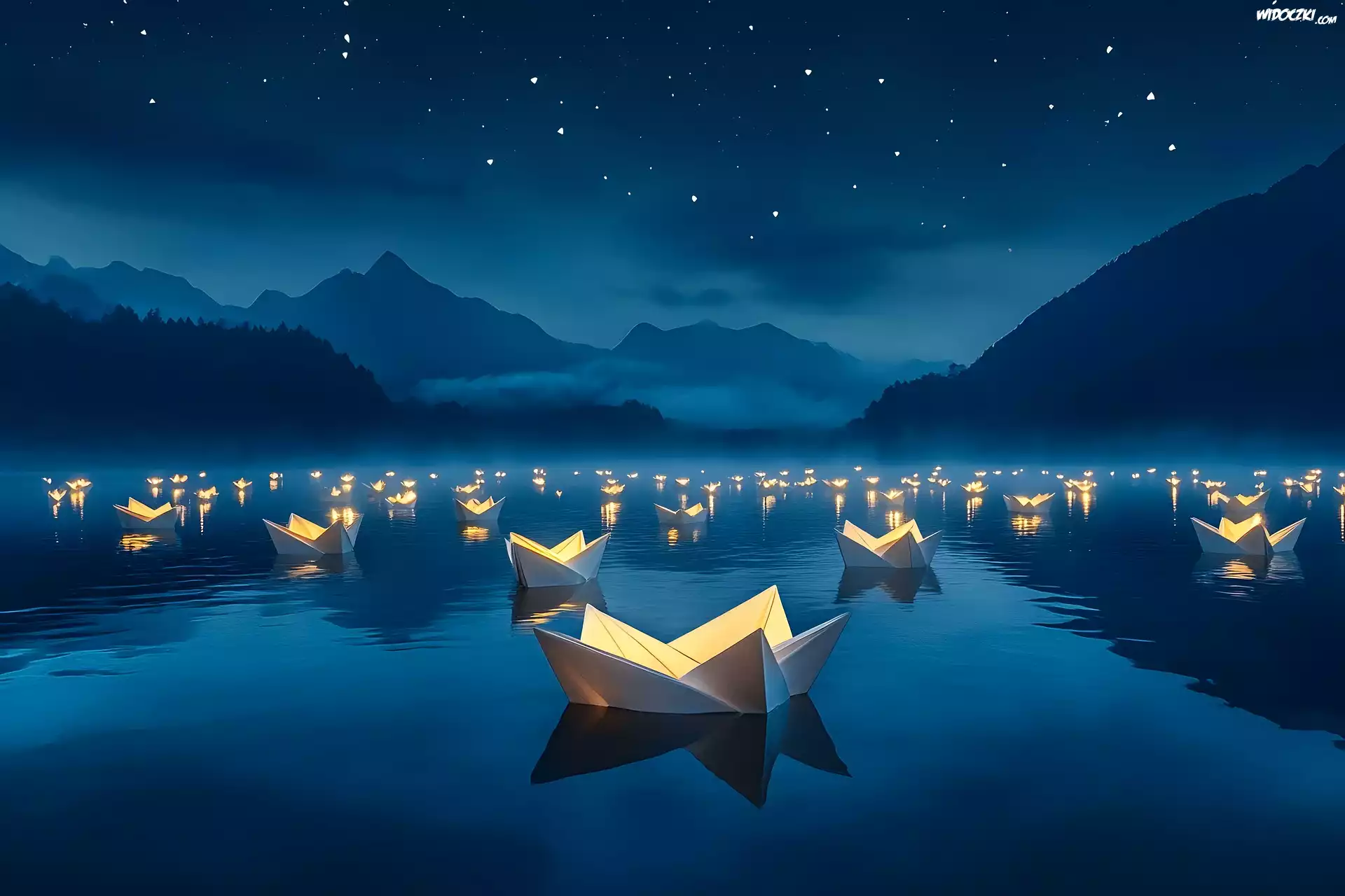 Góry, Jezioro, Papierowe, Łódki, Niebo, Gwiazdy, Noc, Grafika