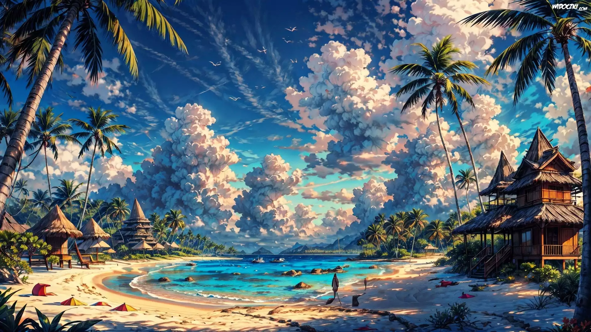 Zatoka, Morska, Plaża, Palmy, Niebo, Bungalow, Chmury, Grafika