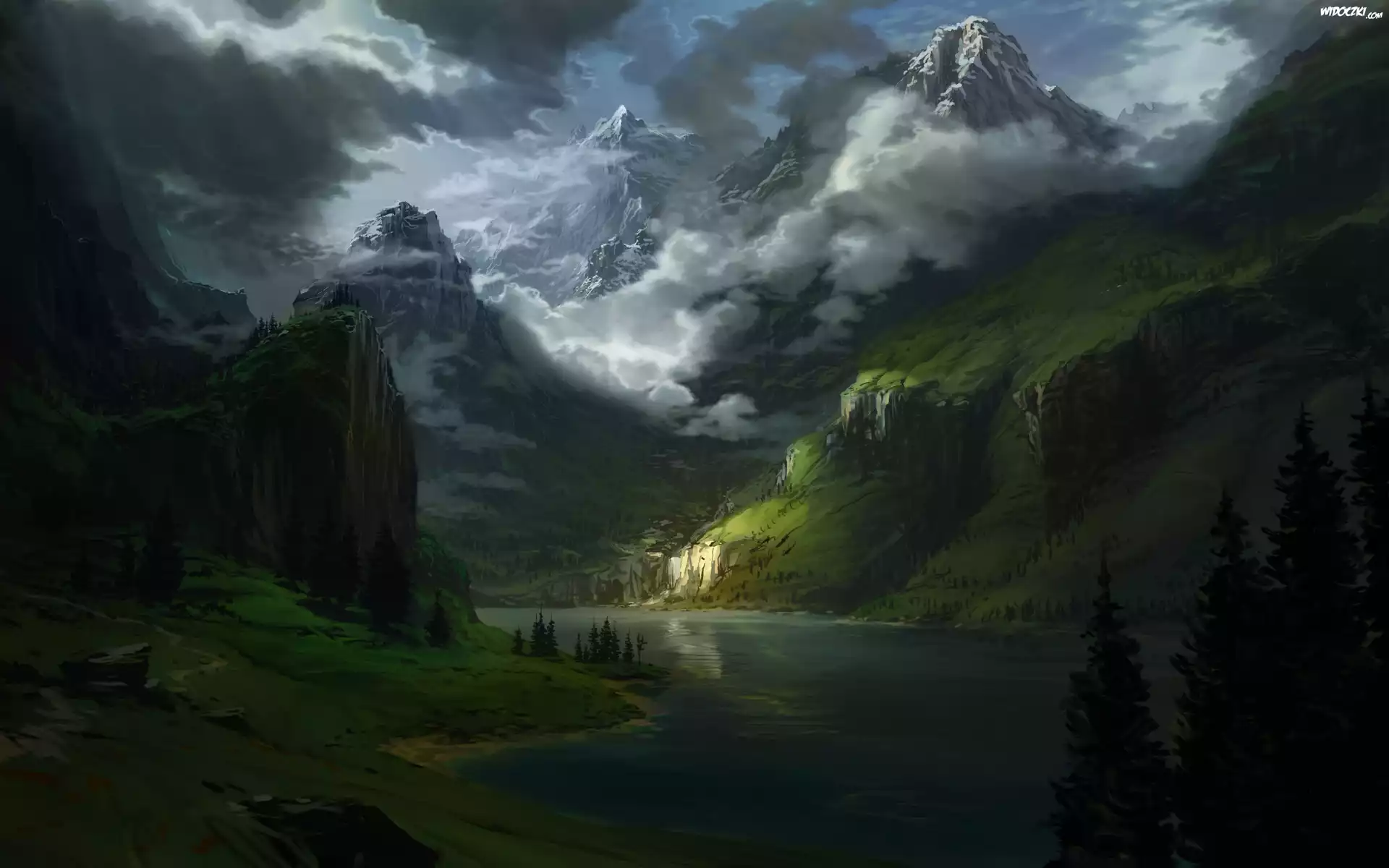 Grafika, Góry, Mgła, Rzeka, Chmury