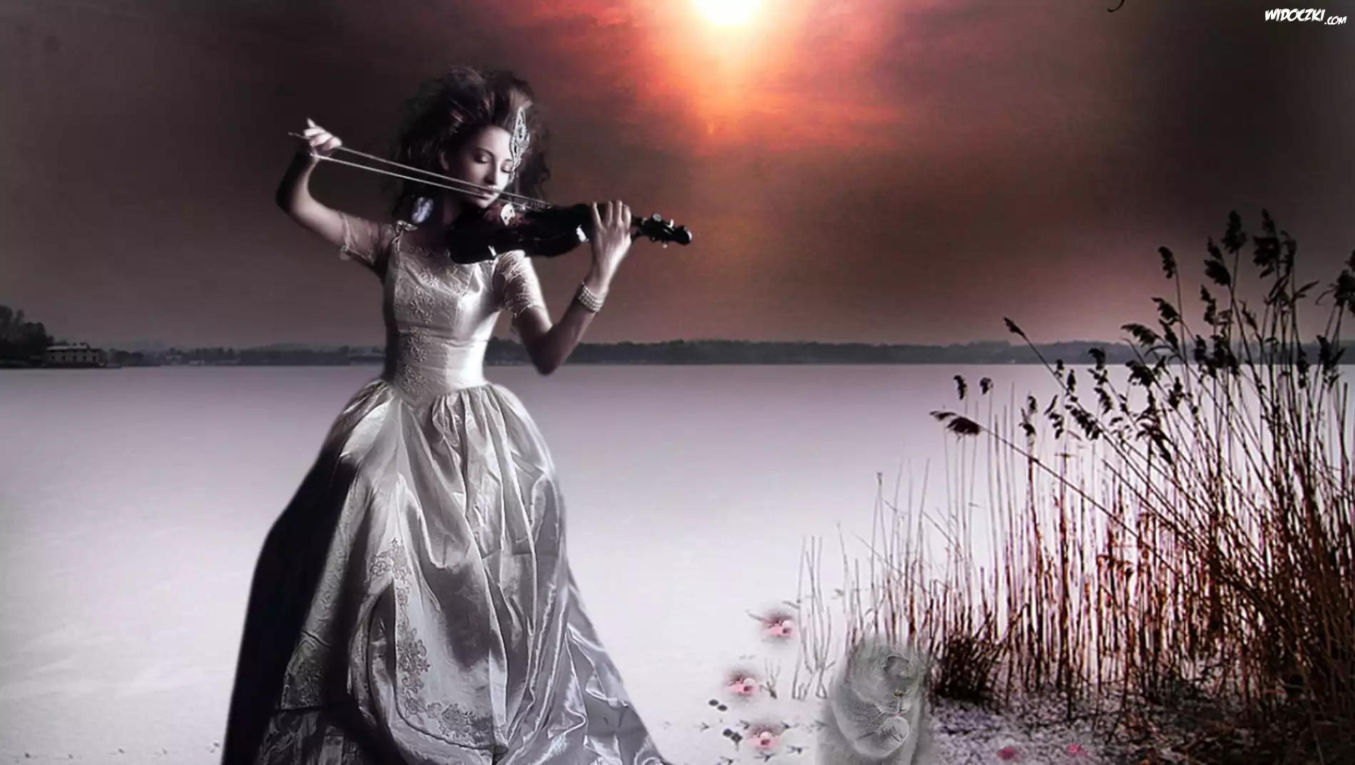 Zdjęcia, Grafika, Kobieta, Skrzypce, Jezioro