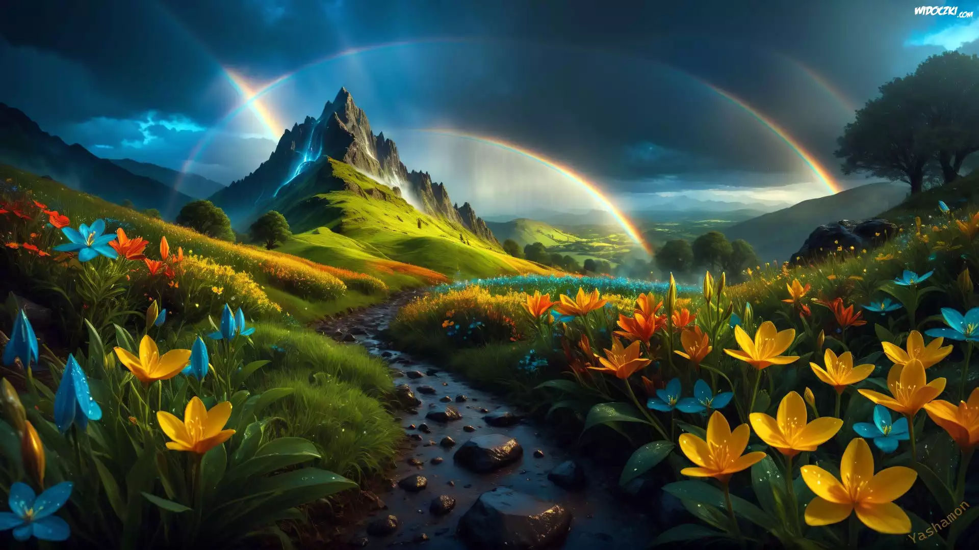Góry, Skały, Tęcza, Strumień, Kwiaty, Kamienie, Drzewa, Grafika