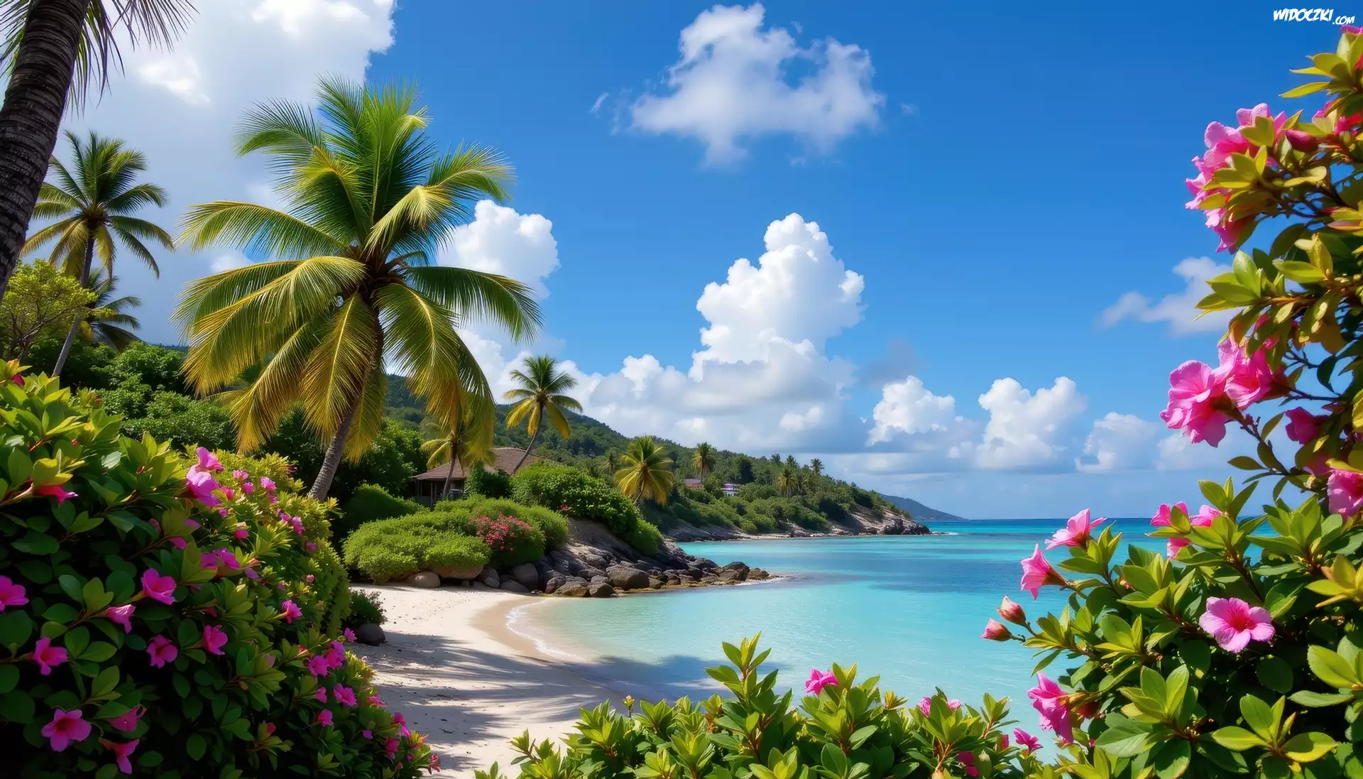 Kwiaty, Plaża, Zatoka, Morze, Wzgórza, Palmy, Tropiki, Grafika
