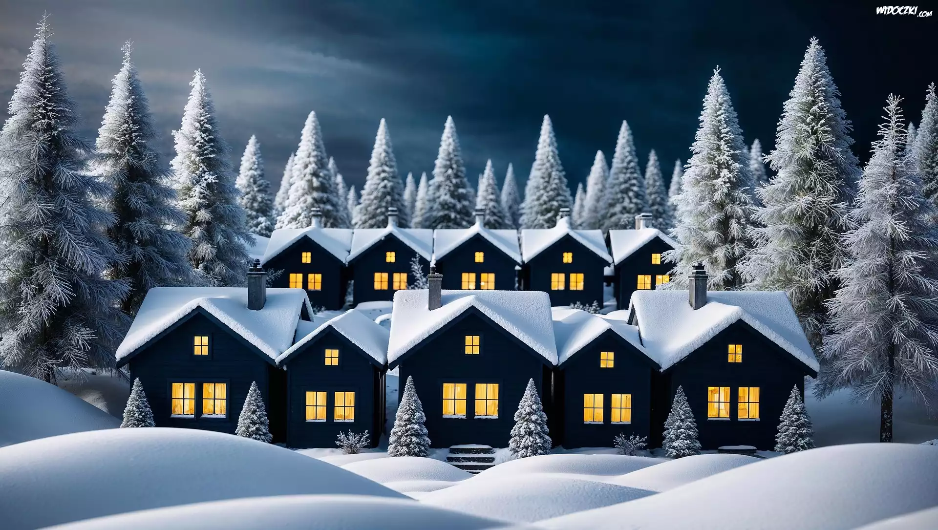 Zima, Drzewa, Domy, Grafika